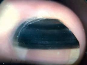 甲下出血或甲下血肿是最常见的甲异色原因之一。诊断甲下出血需详细询问病史,比如有无创伤和使用抗血栓的药物。甲下出血或甲下血肿的皮肤镜特点:不规则形或圆形的黑色、紫色或红色斑片,短而细的纵行条纹,周围颜色逐渐减退,呈紫色或褐色,有时可见甲周皮肤伴发出血。在甲下出血斑的周围可出现一些小的圆形出血点,尤其在皮肤镜下出血斑远端出现这种出血点是诊断甲下出血的有力证据。甲半月下的出血,因为近端甲板与其下甲母质连接较疏松,并且没有甲床与甲板的纵脊,血液可积聚形成圆形斑片,可通过透明的甲小皮观察到,此现象应与黑色素瘤的哈钦森征(Hutchinson’s sign)鉴别(图2-4-3)。