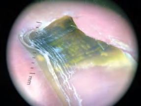 甲下乳头状瘤是一种良性的肿瘤,它起源于远端的甲母质或者甲床,典型的表现是纵行白甲或者红甲。病变常不累及近端甲母质。偶见甲下乳头状瘤表现为纵行黑甲。皮肤镜观察甲板远端游离缘常可看到一个楔形的角化过度增生物(图2-4-5)。