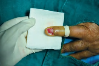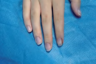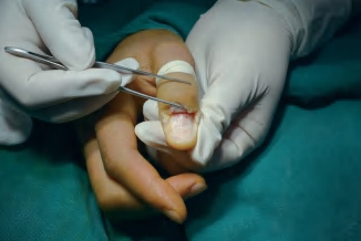 有学者主张掀起比纵行黑甲两侧稍宽的一条纵行甲板暴露皮损,切除色素病变,但这种方法难以分辨病灶颜色较浅的边缘,暴露和去除病灶可能不充分,造成复发。为了更明确病灶的边界,可以在病灶边缘皮下注射生理盐水或局部麻醉药物(图2-5-3),使病灶周围甲床变得苍白,增加病灶和正常组织的对比度,更有把握完全切除病灶。