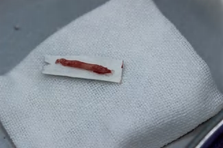 获得的标本应该铺平在一张滤纸上并标出皮损的方向(图2-5-4),利于病理医生定位和明确切片方向,否则条形样本可能会在固定液中卷曲,不利于病理医生固定和切片。怀疑黑色素瘤的标本需连续切片,以明确诊断。