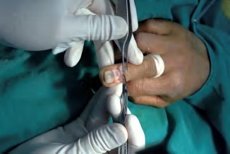 甲活检应该在最大限度保留甲的功能和外形的同时,获得足够的、适宜的组织。甲活检和皮肤活检最大的区别是坚硬的甲板对手术造成的困难,在一些伴有甲板增厚的疾病中尤其明显。手术前夜用10%的尿素软膏封包软化甲板,或者让患者在手术前用温水浸泡30 min软化甲板,可以使甲板易于切割。活检目的不同,需要切开的甲板范围也不相同,尽量只掀开部分甲板。保留甲板,有利于减少创伤,缩短恢复时间,减少甲变形可能。具体拔甲和手术术式可参见“甲肿瘤”和“甲外科”章节。