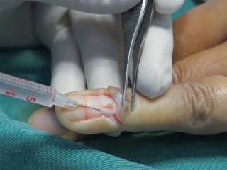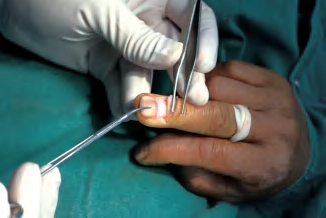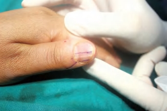 有学者主张掀起比纵行黑甲两侧稍宽的一条纵行甲板暴露皮损,切除色素病变,但这种方法难以分辨病灶颜色较浅的边缘,暴露和去除病灶可能不充分,造成复发。为了更明确病灶的边界,可以在病灶边缘皮下注射生理盐水或局部麻醉药物(图2-5-3),使病灶周围甲床变得苍白,增加病灶和正常组织的对比度,更有把握完全切除病灶。