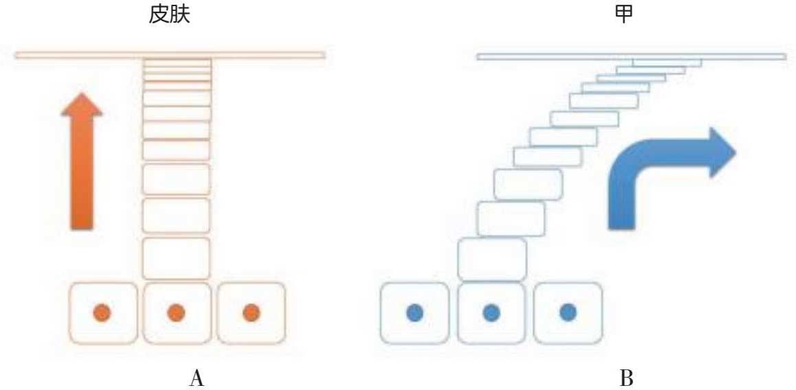 图1-1-6 皮肤与甲板生长时角质细胞增殖分化的方向