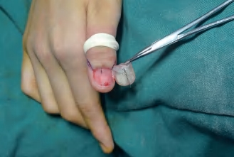 甲下血管球瘤手术时,切开并反折近端甲皱襞,拔去近端甲板后,暴露出甲皱襞与甲床共同组成的、用于包裹甲板的“甲袋”。