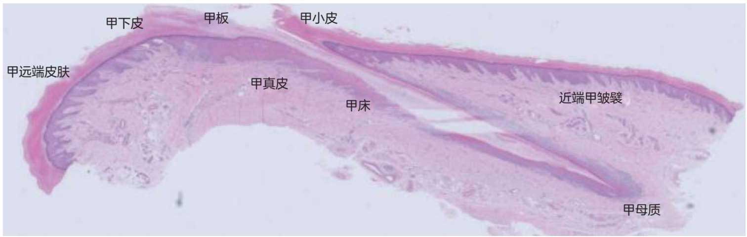 甲母质近端和近端甲皱襞腹侧的上皮相连,远端和甲床相连。甲母质的角质细胞持续增殖和分化,沿向前上的斜行轴持续产生甲板(图1-1-6)。