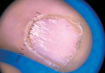 甲母质疾病患者拔甲暴露甲床时,可见甲床表面和甲板的腹侧有相互嵌合的纵脊,而近端甲母质(甲半月及其近端)处光滑无纵脊。