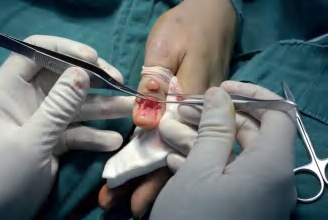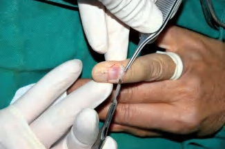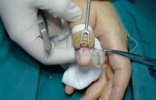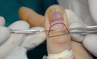 甲下血管球瘤手术时,切开并反折近端甲皱襞,拔去近端甲板后,暴露出甲皱襞与甲床共同组成的、用于包裹甲板的“甲袋”。