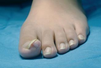 行纵行黑甲切除术时,翻开近端甲皱襞,暴露出其下甲母质,以利于切除皮损。本例患者甲母质可见一褐色色素皮损。