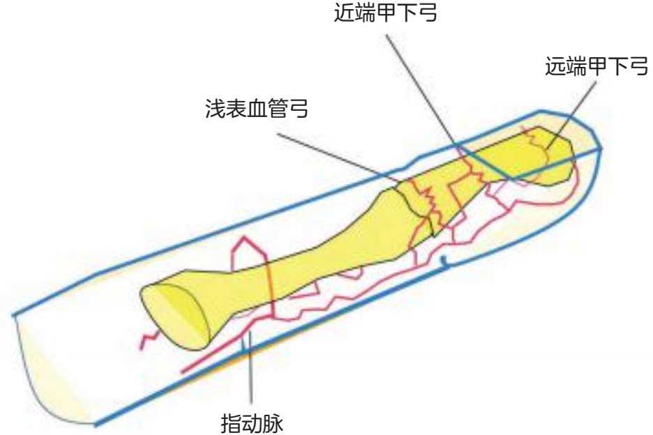 指的血供主要由成对的掌指动脉提供,血液主要来自深、浅掌动脉弓。远端指骨处两侧的血管由背侧和掌侧的血管弓吻合起来,掌侧弓被指腹保护。背侧甲皱襞血管弓又叫浅表血管弓,由两侧的指动脉向前延伸在最远端指关节处形成,提供甲皱襞和伸肌肌腱附着点的血供,此处血管走行蜿蜒曲折,向甲母质发出多个分支。将甲板远端游离缘向后推或上下摇动,可以看到远端指关节前,大概在甲小皮向后5 mm处的皮肤可能发生高低和颜色的变化,此处既是背侧甲皱襞弓的所在的位置,也是甲袋的所在位置。更远端的甲下组织由远端和近端甲下弓来供血(图1-1-9)。