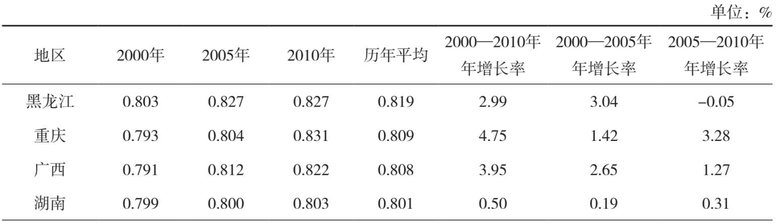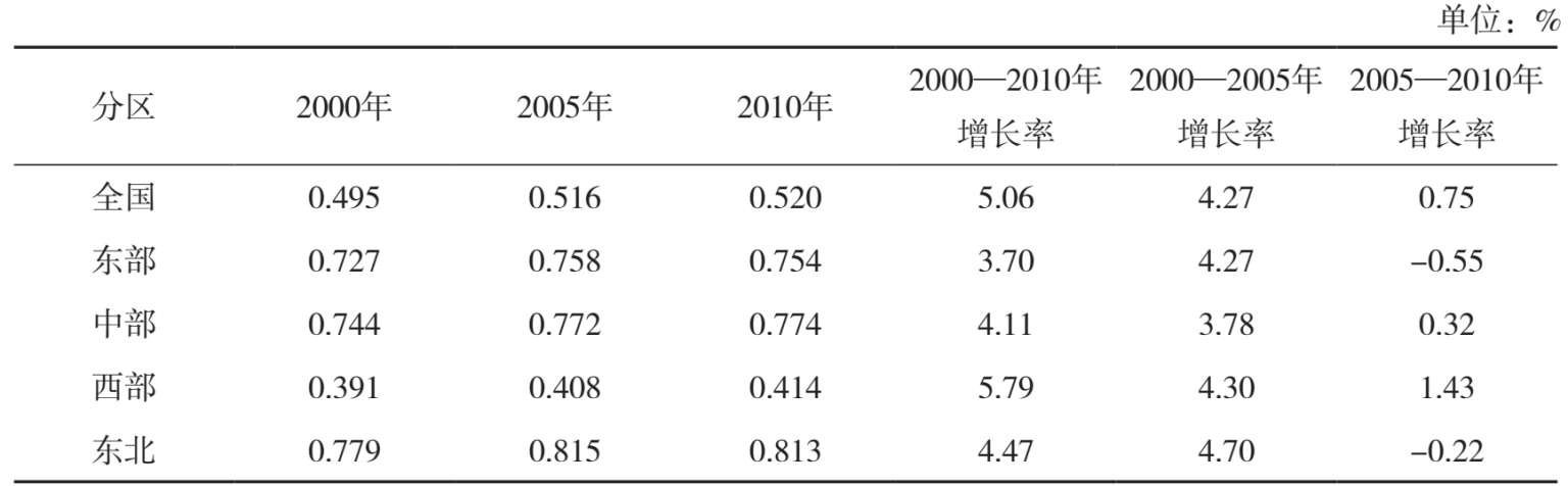 中部地区的AMNDVI值,2000年为0.744,2005年为0.772,2010年为0.774,10年总体上升4.11%,2000—2005年上升3.78%,2005—2010年上升0.32%。植被覆盖增加的趋势明显减缓。
