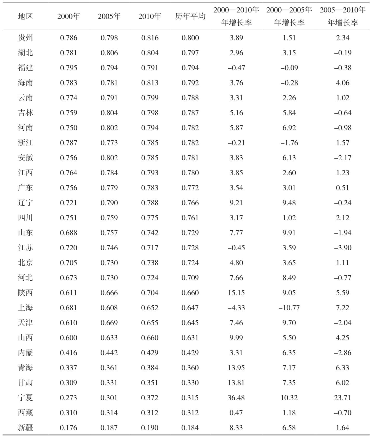 从年际变化情况来看,2000—2010年AMNDVI增长最快的5个省区是宁夏、陕西、青海、甘肃、山西,增长率分别为36.48%、15.15%、13.95%、13.81%、9.99%。这些地区的植被恢复得益于我国三北防护林体系工程的实施,生态环境正在逐步好转。然而,在全国总体植被覆盖好转的大趋势下,也有少数省市的植被覆盖状况出现了退化。例如上海、福建、江苏和浙江,10年间AMNDVI分别下降了4.33%、0.47%、0.45%、0.21%。这些地区都是人口极其密集的区域,人类活动对当地生态环境的影响已经超过生态系统的承受能力,植被生态已经呈现出明显的退化迹象。