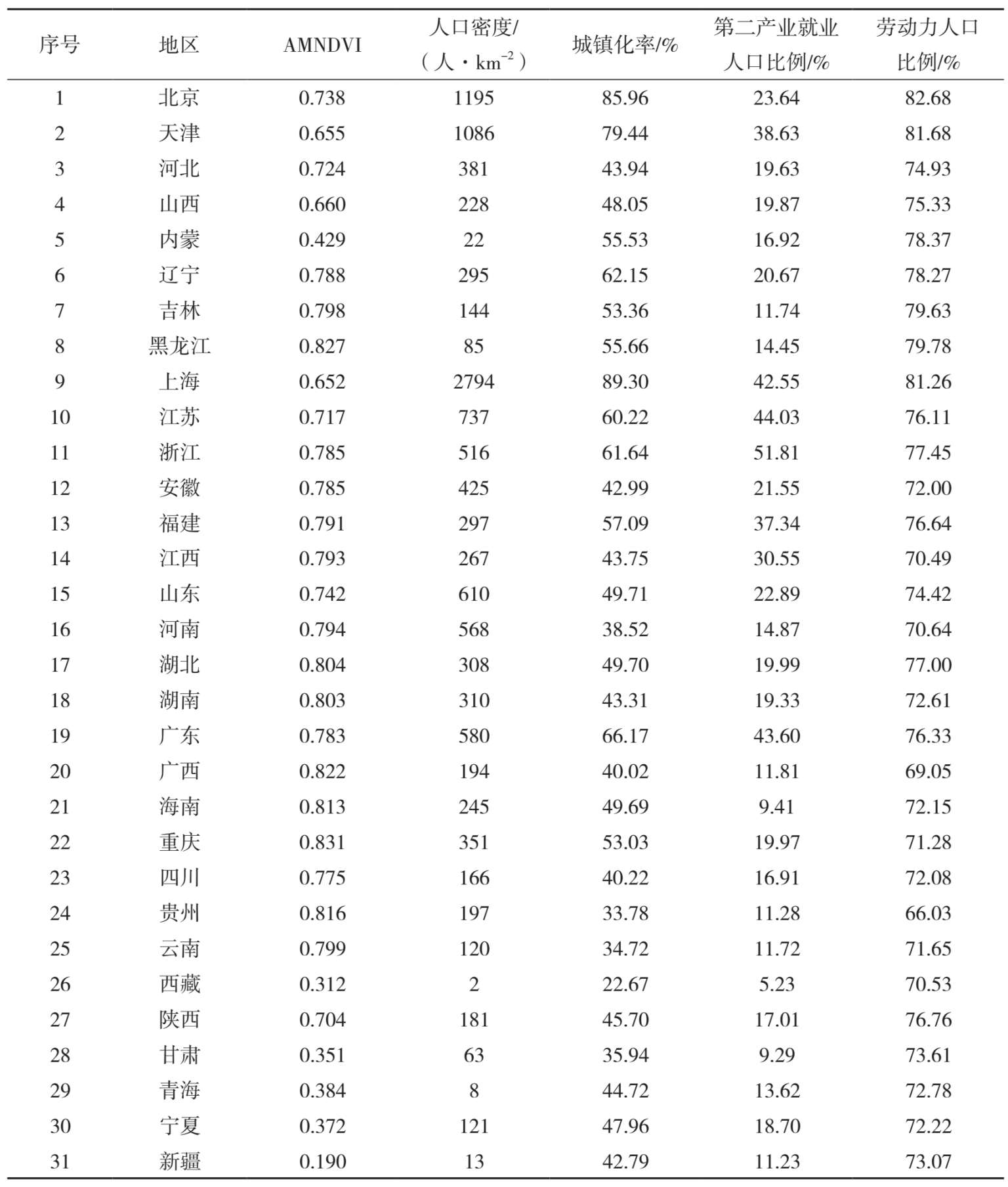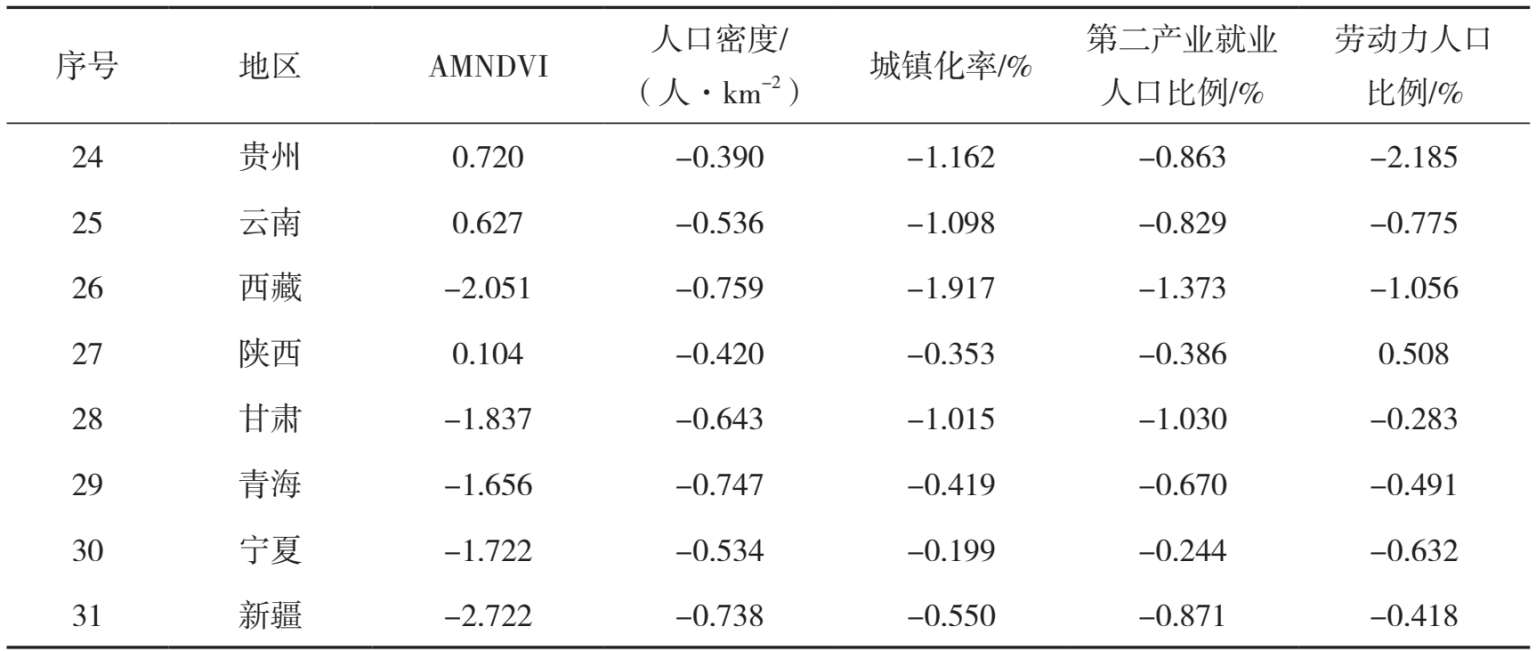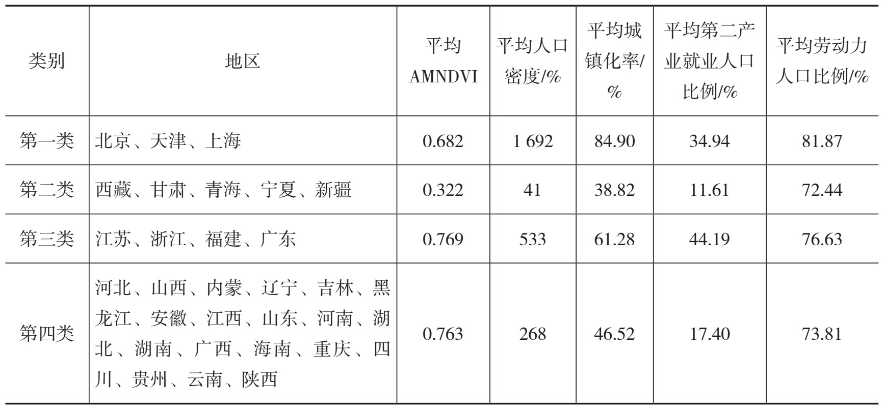 第三类是高植被覆盖、人口密度较高、第二产业就业人口比例高的区域,包括江苏、浙江、福建和广东4个经济发达省份。它们的平均AMNDVI为0.769,总体植被覆盖较好。其平均人口密度为533人·km -2 ,远高于内陆地区。因大力发展劳动密集型产业,该区域吸引了大量内地的劳动力,第二产业就业人口比例高达44.19%,为全国最高。这类区域应该加快产业转移和结构升级,逐渐淘汰高能耗、高污染与低附加值产业,腾出空间发展高技术、高附加值产业;引进现代服务业高端人才和高新技术人才,加快发展现代服务业;继续推进人口城镇化发展,推进土地节约集约利用,腾出生态建设空间。