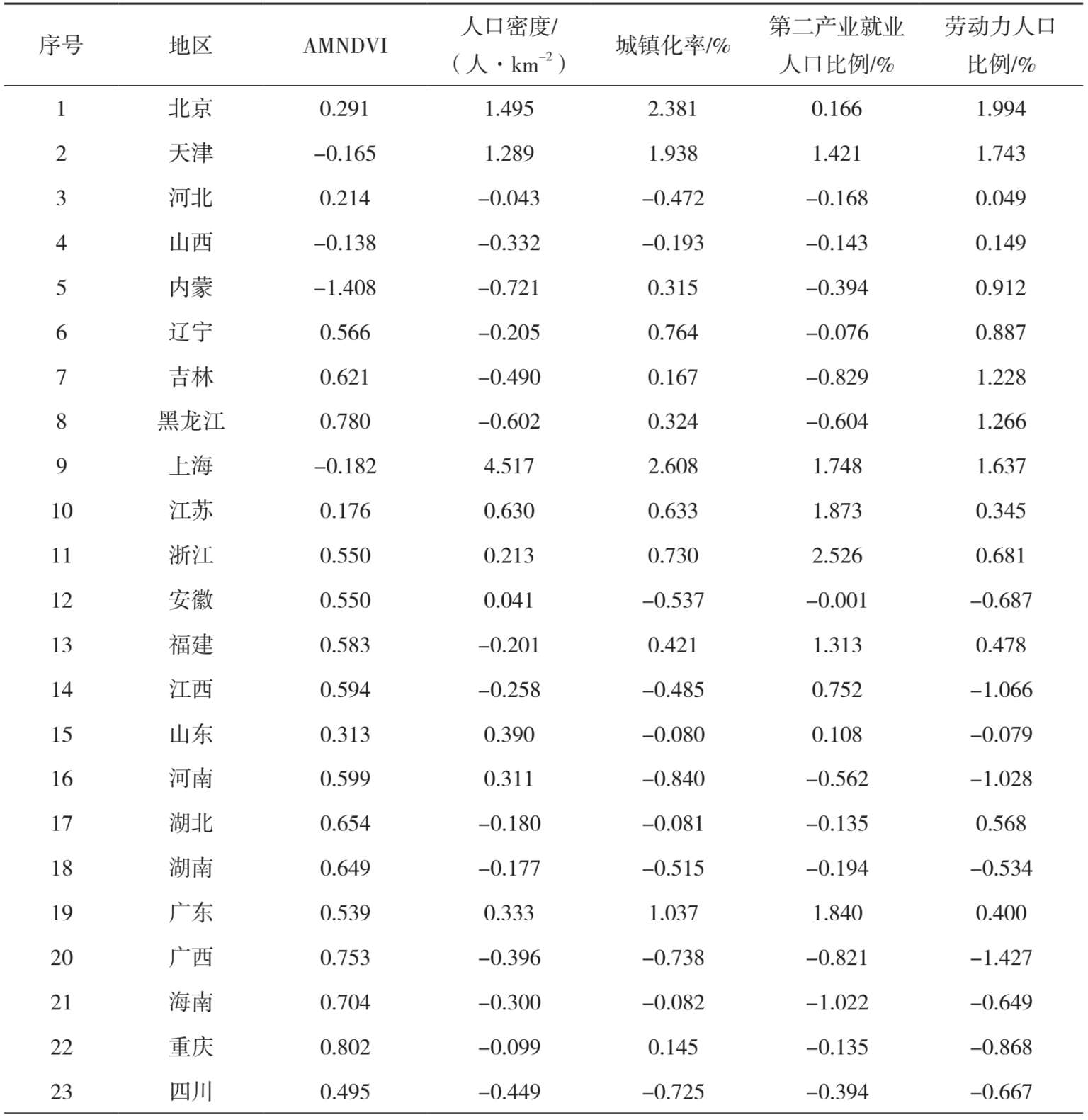 表1-11 2010年我国31省市人口发展与植被覆盖状况标准化值