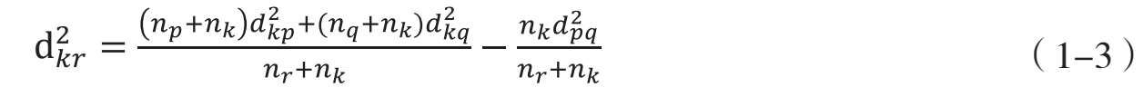 假定某一个步骤将类G p 和类G q 合并为新类G r ,并且类G p 包括 n p 个样本,类G q 包括 n q 个样本,则新类G r 包括 n r = n p + n q 个样本。这样,任意一个包括 n k 个样本的类G k 到类G r 的距离为: