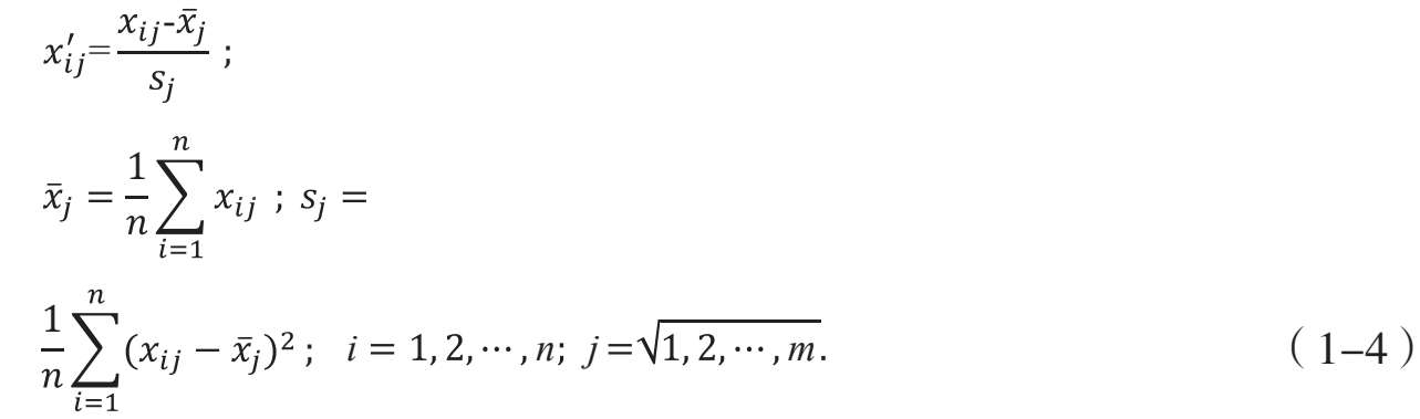 式中, n 为样本个数; m 为统计指标个数; 为第 i 个样本的第 j 个变量的统计数据标准化值; 为第 i 个样本的第 j 个变量的原始统计数据; n 个样本的第 j 个变量的平均值。