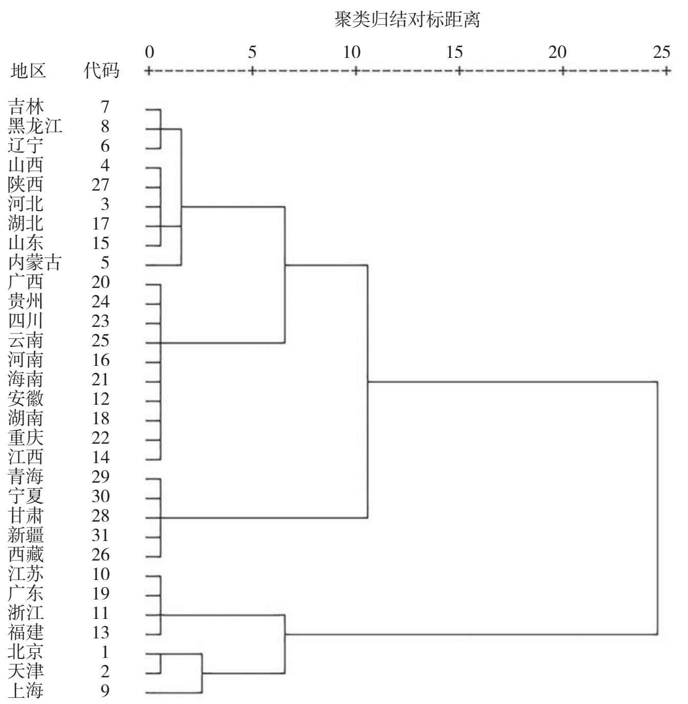 前文虽已按国家有关文件把我国划分为四大经济区域,对各区域的人口总量、人口结构和植被覆盖现状进行了阐述。但是,本研究着重考察的是人口发展与植被覆盖变化的耦合关系,基于经济基础的区域划分并不能完全地反映区域内部两者关系的相似性,也不能充分反映区域之间两者关系的差异性。因此,我们认为有必要从人口发展与植被覆盖变化耦合关系的角度出发,对我国31个省、自治区、直辖市进行聚类分析,并以此为依据,对各区域提出具有针对性的政策建议。