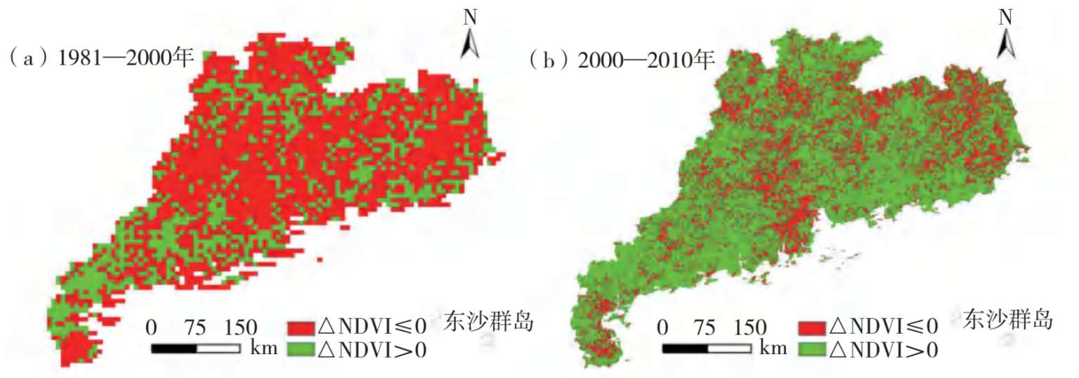 注:图(a)1981—2000年广东省植被覆盖时空变化图,数据来源于GIMMS NDVI数据;图(b)2000—2010年广东省植被覆盖时空变化图,来源于MODIS NDVI数据。