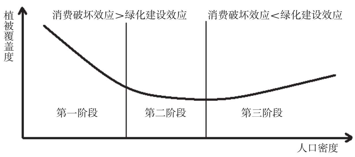 在第二阶段,植被覆盖度大幅降低引起的生态环境恶化使得人们对植被生态功能的认识加强,对植被生态效应的需求增加,政府开始加强植被保护和城镇绿化建设规划,并采用更加节约土地的居住方式。与此同时,随着公共设施越来越完善,人口增长带来的消费破坏效应趋于变小。这使得绿化建设效应逐渐抵消消费破坏效应,人口增长与植被覆盖的负相关关系得到弱化,植被覆盖度随着人口增长呈缓慢下降趋势。