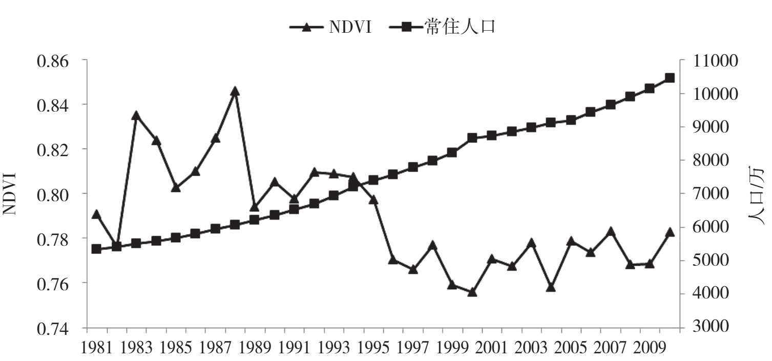 图1-29 1981—2010年中国广东省的人口增长和植被覆盖变化情况