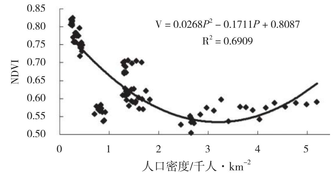 为了定量检验人口增长与植被覆盖间的长期关系,借鉴EKC(Environmental KuznetsCurve)模型(Grossman,et al,1991),我们构建了一个二次多项式的简化模型: