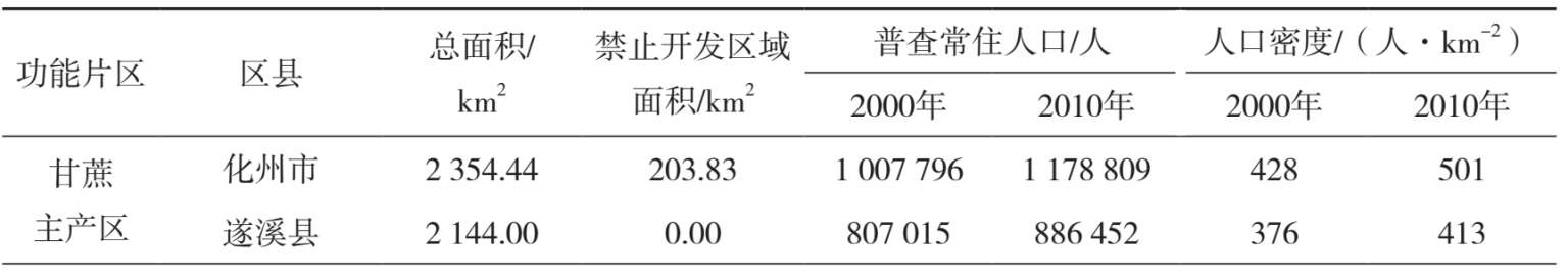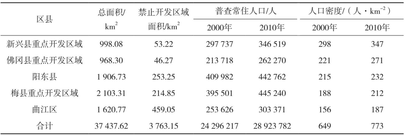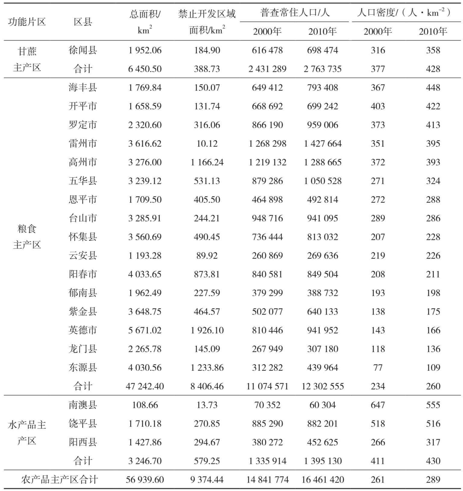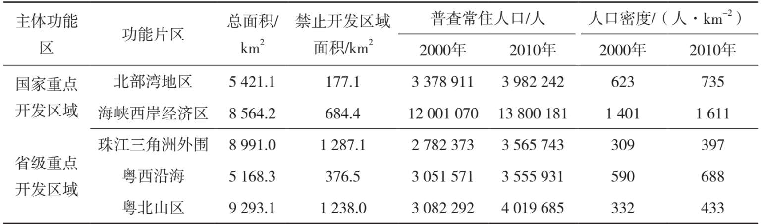 表2-7 广东省优化开发区域各功能单元的面积和人口密度