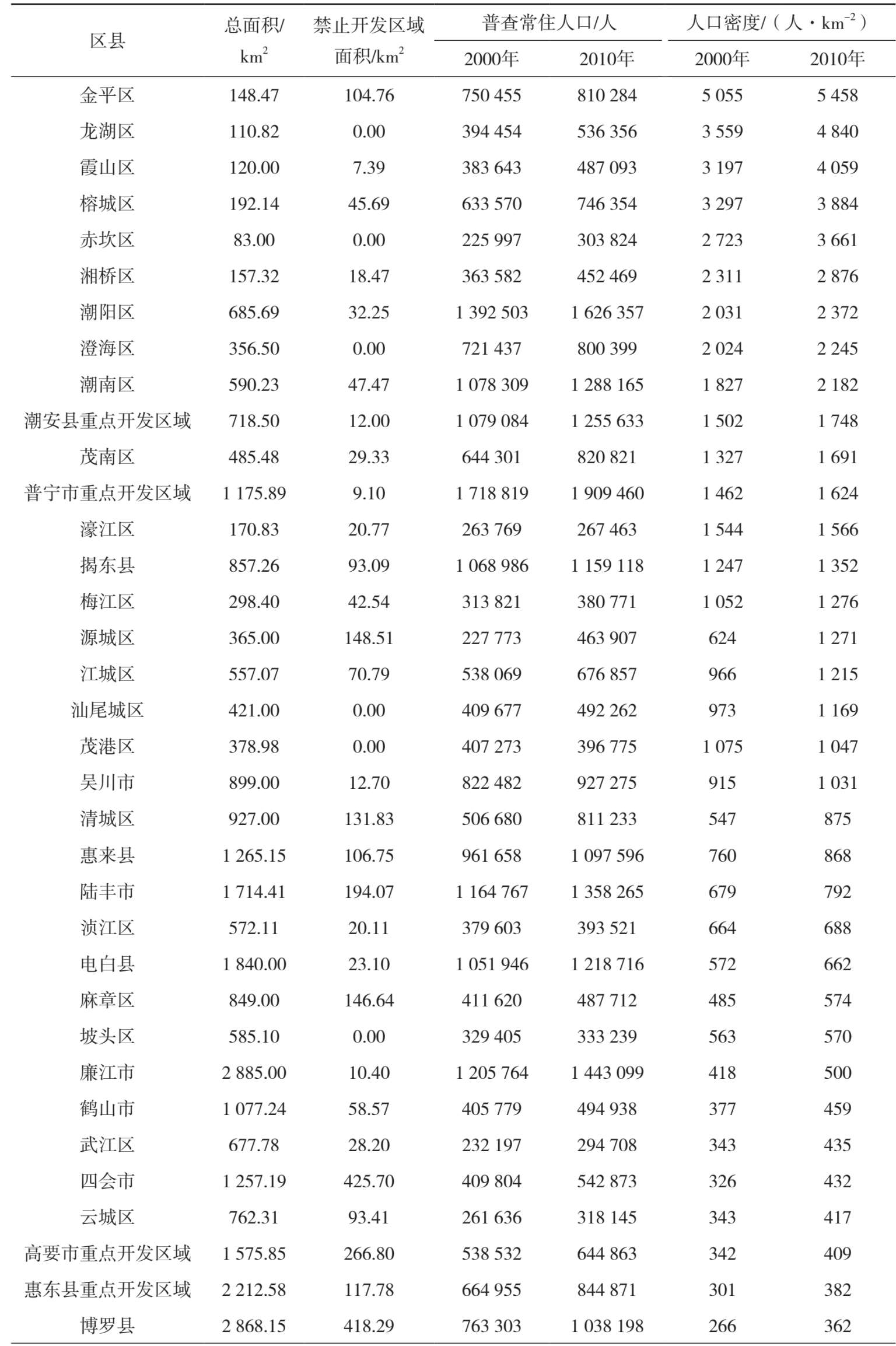 全省重点开发区域共有40个功能单元区,分别位于珠江三角洲外围、东西两翼和粤北山区。其中有23个单元为市辖区,10个单元为县, 7个单元为县级市。各功能单元区的人口密度变化也比较大,人口最密集的汕头市金平区2010年人口密度达到5 458人·km -2 ,而同期韶关市曲江区的人口密度只有187人·km -2 (表2-9)。