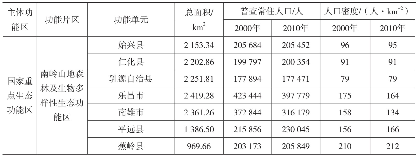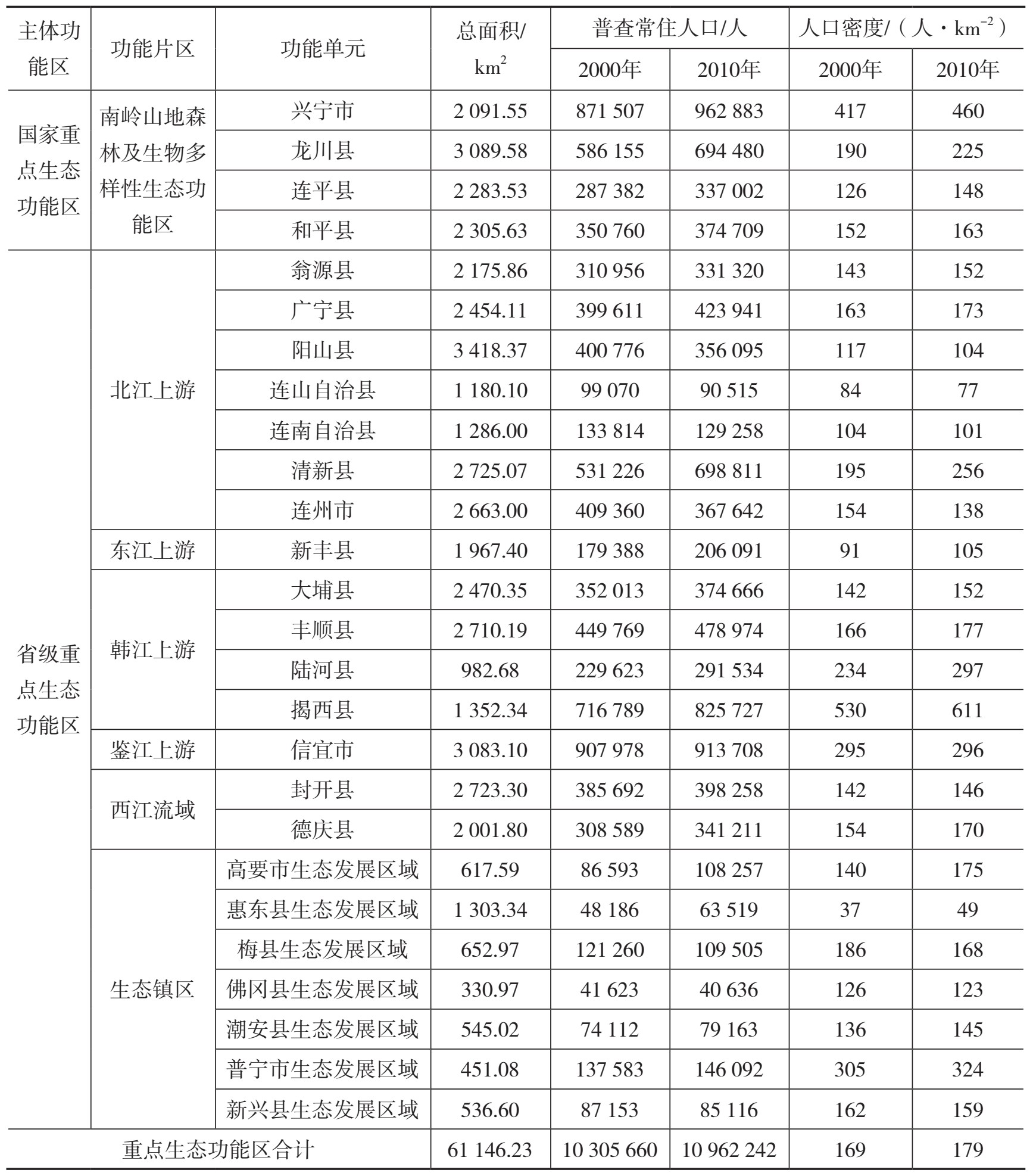 重点生态功能区划分为国家级重点生态功能区和省级重点生态功能区两类,主要承担山地森林及生物多样性保护、水源涵养和空气调节等重要生态功能。2010年重点生态功能区居住人口1 096万人,其中国家级重点生态功能区居住了410万人,省级重点生态功能区居住了686万人。2000—2010年,重点生态功能区常住人口从10 305 660人增加到10 962 242人,年均增长0.62%,大大低于全省人口在此期间的年均增长率(2.04%),低于同期全省人口自然增长率(0.83%),接近同期全国人口自然增长率(0.57%)。考虑到南方人口自然增长率明显高于全国水平,重点生态功能区人口外迁趋势明显。但是,2010年重点生态功能区的人口密度为179人·km -2 ,比2000年增加了10人·km -2 ,人口密度还在增大,人口压力仍然存在。