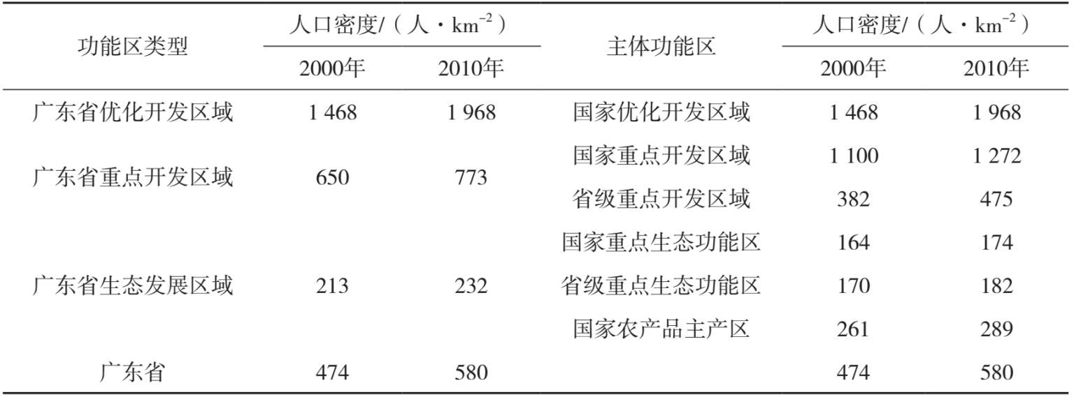 不同类型主体功能区域2000—2010年人口密度变化计算结果见表2-6。2010年全省人口密度为580人·km -2 ,在世界范围内,与其他国家或区域比较,仅次于新加坡(2010年人口密度为7 252人·km -2 )和孟加拉国(2010年人口密度为1 142人·km -2 ),超过韩国(2010年人口密度为509人·km -2 )、荷兰(2010年人口密度为493人·km -2 )、印度(2010年人口密度为412人·km -2 )、以色列(2010年人口密度为352人·km -2 )和日本(2010年人口密度为350人·km -2 )等国家,已成为世界上人口最为密集的地区之一。广东省人口密度2010年比2000年增加了106人·km -2 ,年均人口增长率为20.4‰。其中优化开发区域2010年的平均人口密度达到1 968人·km -2 ,是广东省人口密度的3倍多,比2000年增加了500人·km -2 ,年均人口增长率为29.8‰,目前人口密度已接近欧美发达国家都会区人口密度的上限;重点发展区域2010年人口密度为773人·km -2 ,超过全省平均水平,2010年比2000年增加了123人·km -2 ,年均人口增长率为17.6‰,其中国家重点开发区域2010年的人口密度达到了1 272人·km -2 ,已接近发达国家都会区的人口密度水平,而省级重点开发区域2010年的人口密度只有475人·km -2 ,低于目前全省人口密度平均水平;生态发展区域2010年人口密度为232人·km -2 ,不足全省人口密度的一半,人口比较稀少,而2010年只比2000年增加了19人·km -2 ,年均人口增长率为8.7‰,略低于当地人口自然增长水平,目前人口已有缓慢外迁的趋势,说明这些区域总体上是不利于人口发展的。国家农产品主产区人口密度为289人·km -2 ,只相当于全省平均水平的50%,2010年比2000年增加28人·km -2 ,年均人口增长率为10.4‰;省级重点生态功能区和国家级重点生态功能区的人口密度分别只有182人·km -2 和174人·km -2 ,而且在2000—2010年期间,分别只增加了10人·km -2 和12人·km -2 ,也就是每年增加约1人·km -2 ,年均人口增长率分别为6.8‰和5.2‰,低于当地人口自然增长率。