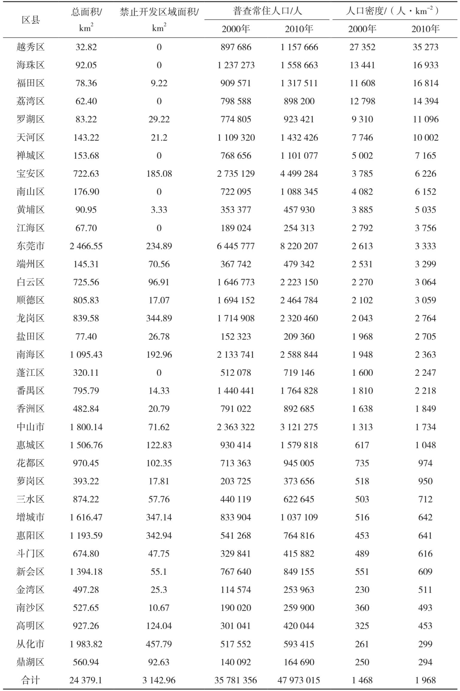 优化开发区域里,2010年人口密度超过10 000人·km -2 的功能单元区有越秀区、海珠区、福田区、荔湾区、罗湖区和天河区等6个,均属于广州和深圳两大中心城市,其中4个位于广州,2个属于深圳。人口密度在5 000~10 000人·km -2 的功能区有4个,分别是禅城区、宝安区、南山区和黄埔区,其中有2个属于深圳市,佛山市和广州市各1个。人口密度在1 000~5 000人·km -2 的功能区有13个,分别是江海区、白云区、东莞市、端州区、顺德区、龙岗区、盐田区、南海区、蓬江区、番禺区、中山市、香洲区和惠城区,珠江三角洲9个地级和地级以上城市都有代表。花都区、萝岗区、三水区、斗门区、惠阳区、增城市、新会区、金湾区、南沙区和高明区等10个单元区的人口密度介于450~1 000人·km -2 ,还有较大的人口发展潜力。从化市和鼎湖区两个单元的人口密度少于300人·km -2 ,均属于低山丘陵区域,其中从化市包含禁止开发区域457.79 km 2 ,鼎湖区包含禁止开发区域92.63 km 2 ,人口发展受到了不同程度的制约。