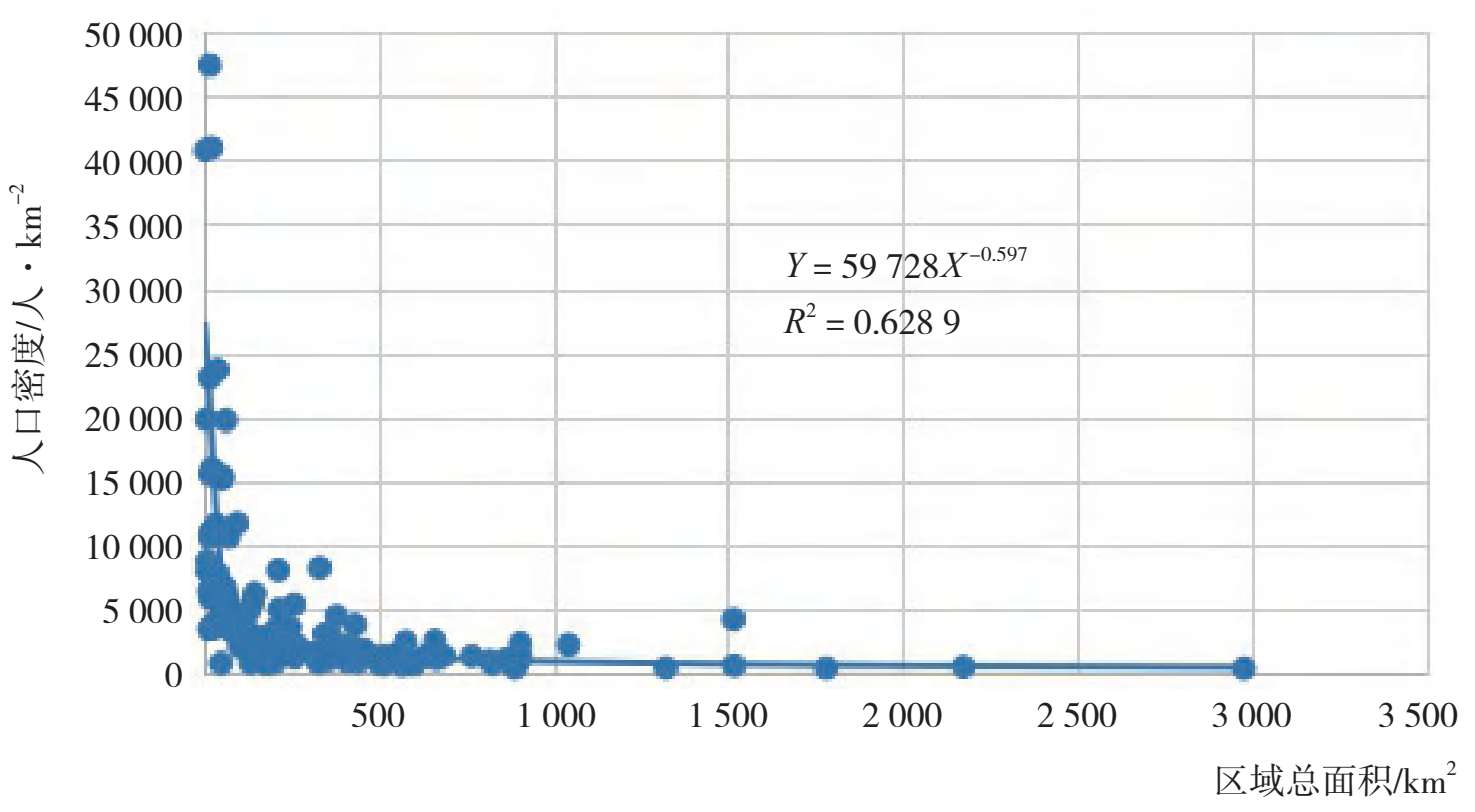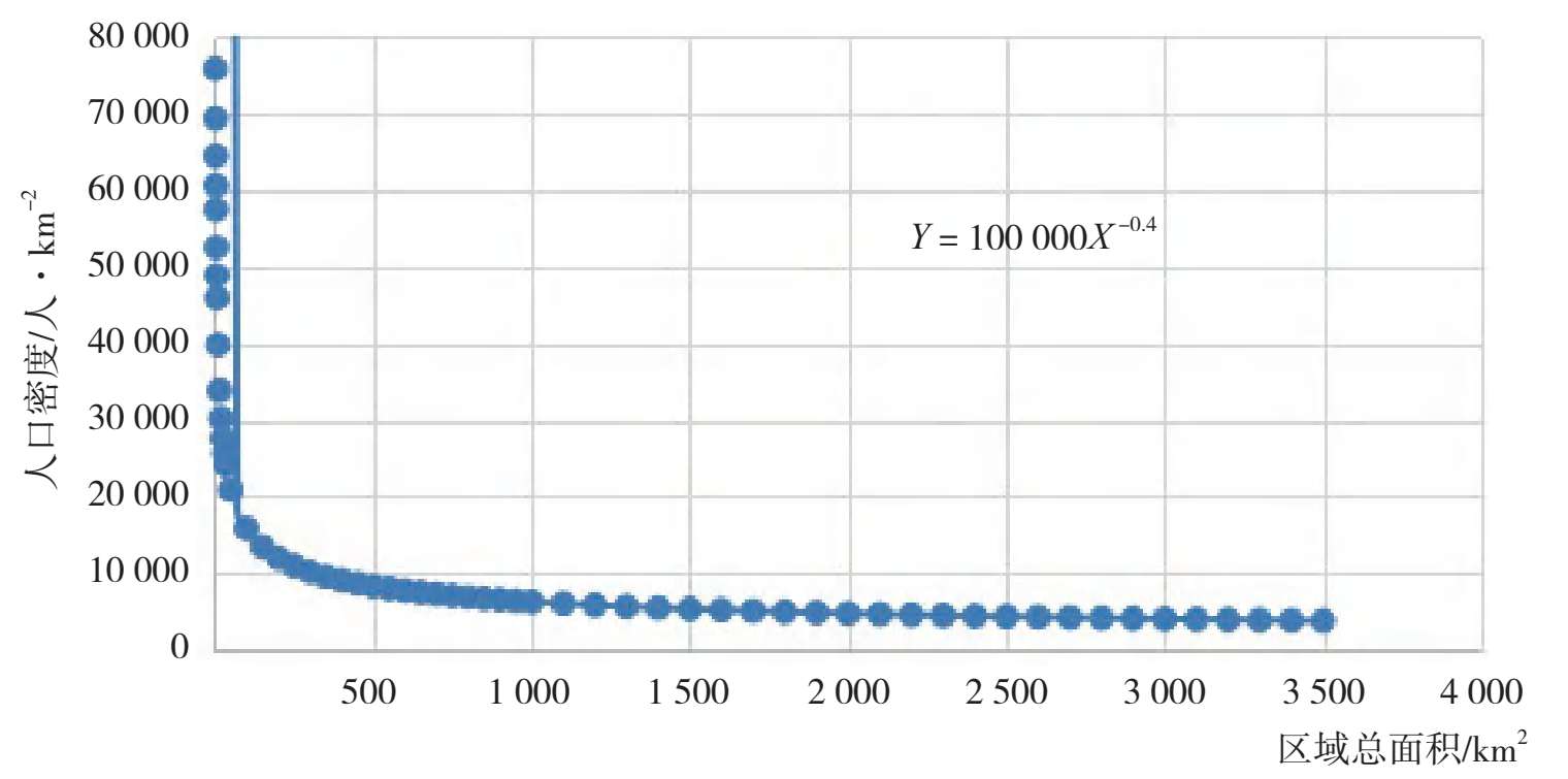 可居住面积越大的区域,其功能越综合、越多样;而可居住面积越小的区域,功能越单一、越简单。一个小的区域,人口密度可以很大,但是一个很大的区域如果人口密度也很大,则其资源支撑和生态产品需求就难以保障。对广东130个主体功能单元的人口密度和其可居住面积做散点图,发现各功能单元的人口密度与其可居住面积大小有明显的幂函数关系。