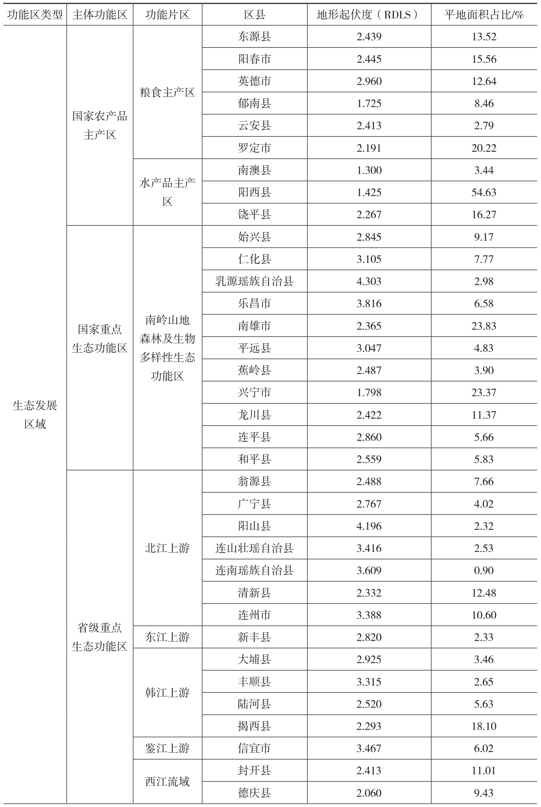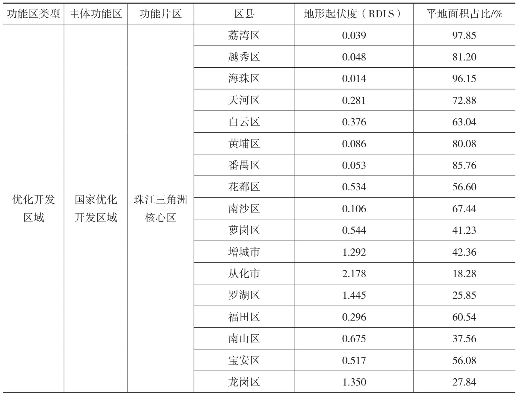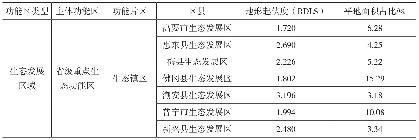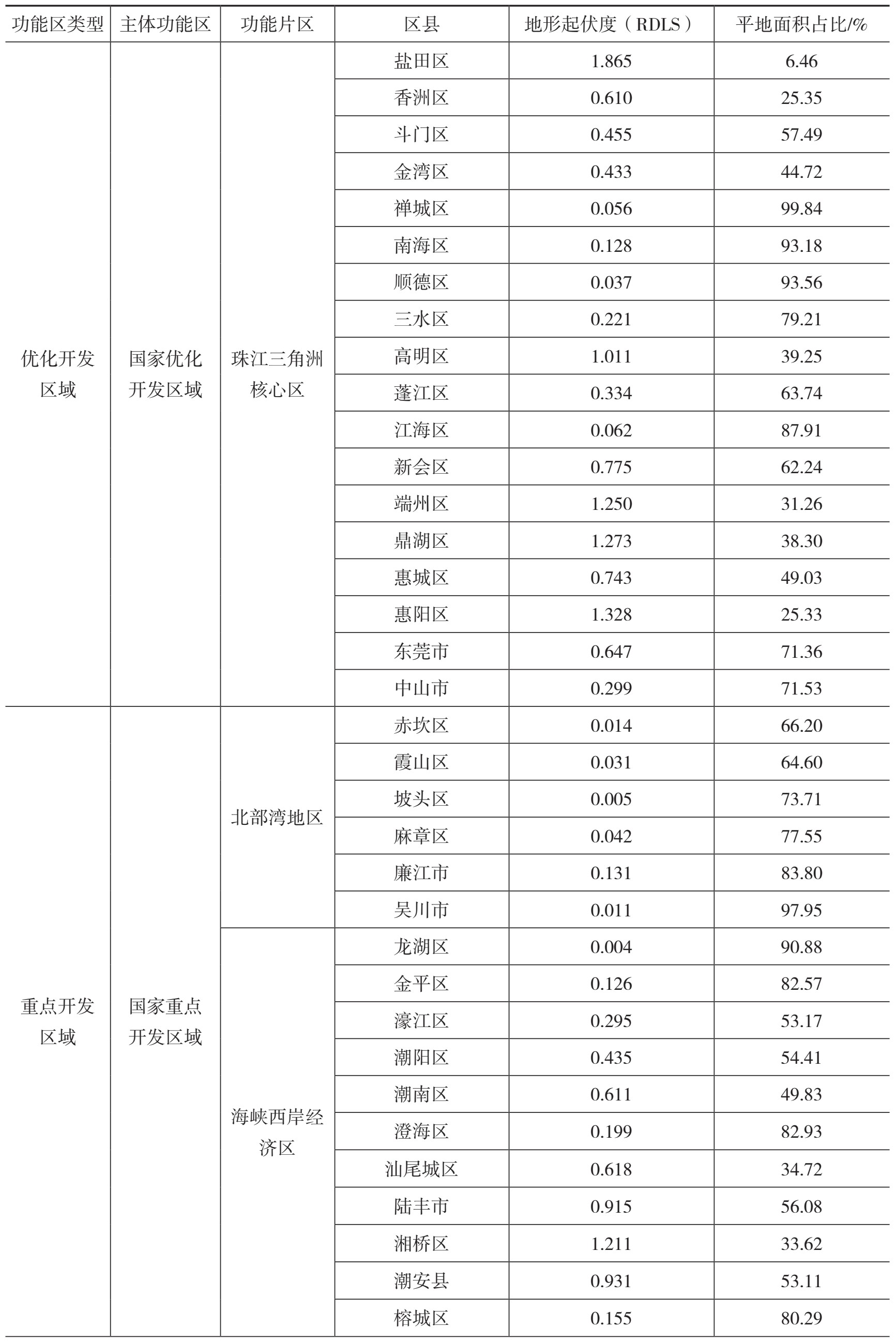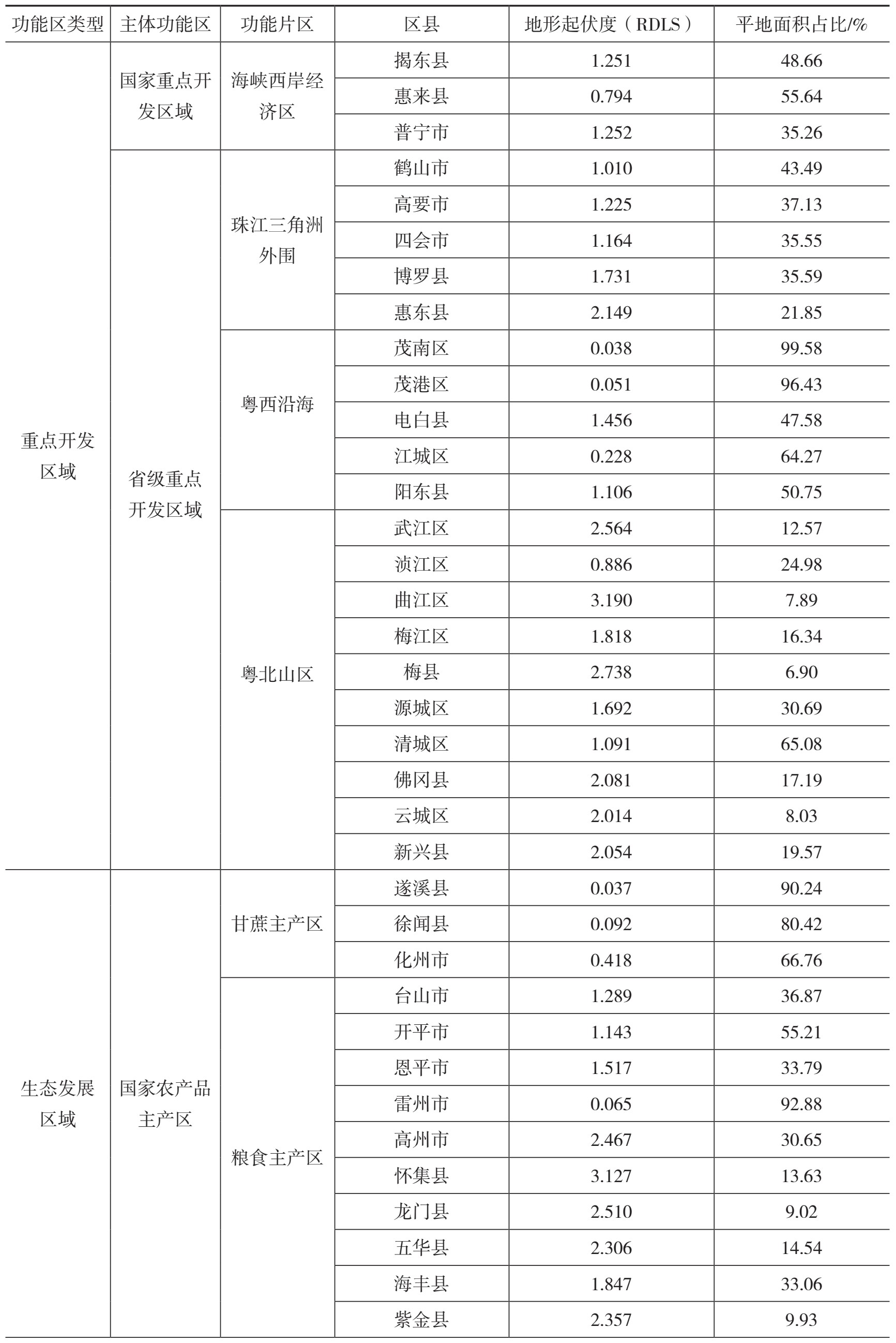 表2-12 广东130个功能区域的地形起伏度与平地面积占比