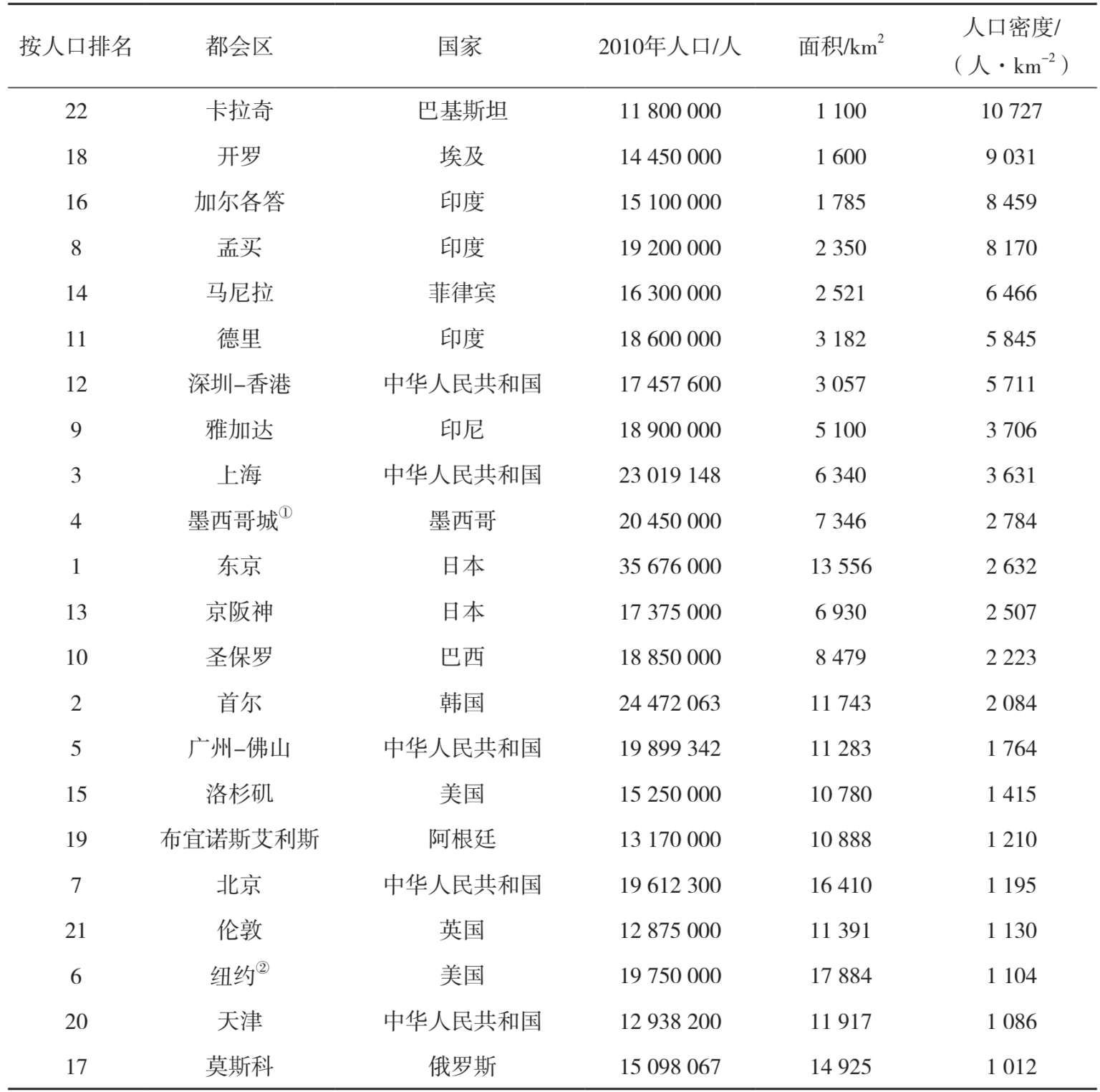 表2-13 世界21个1 000万人口以上的都会区人口密度