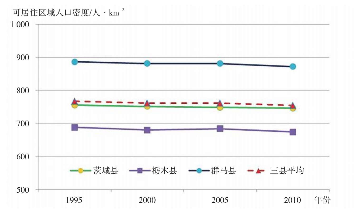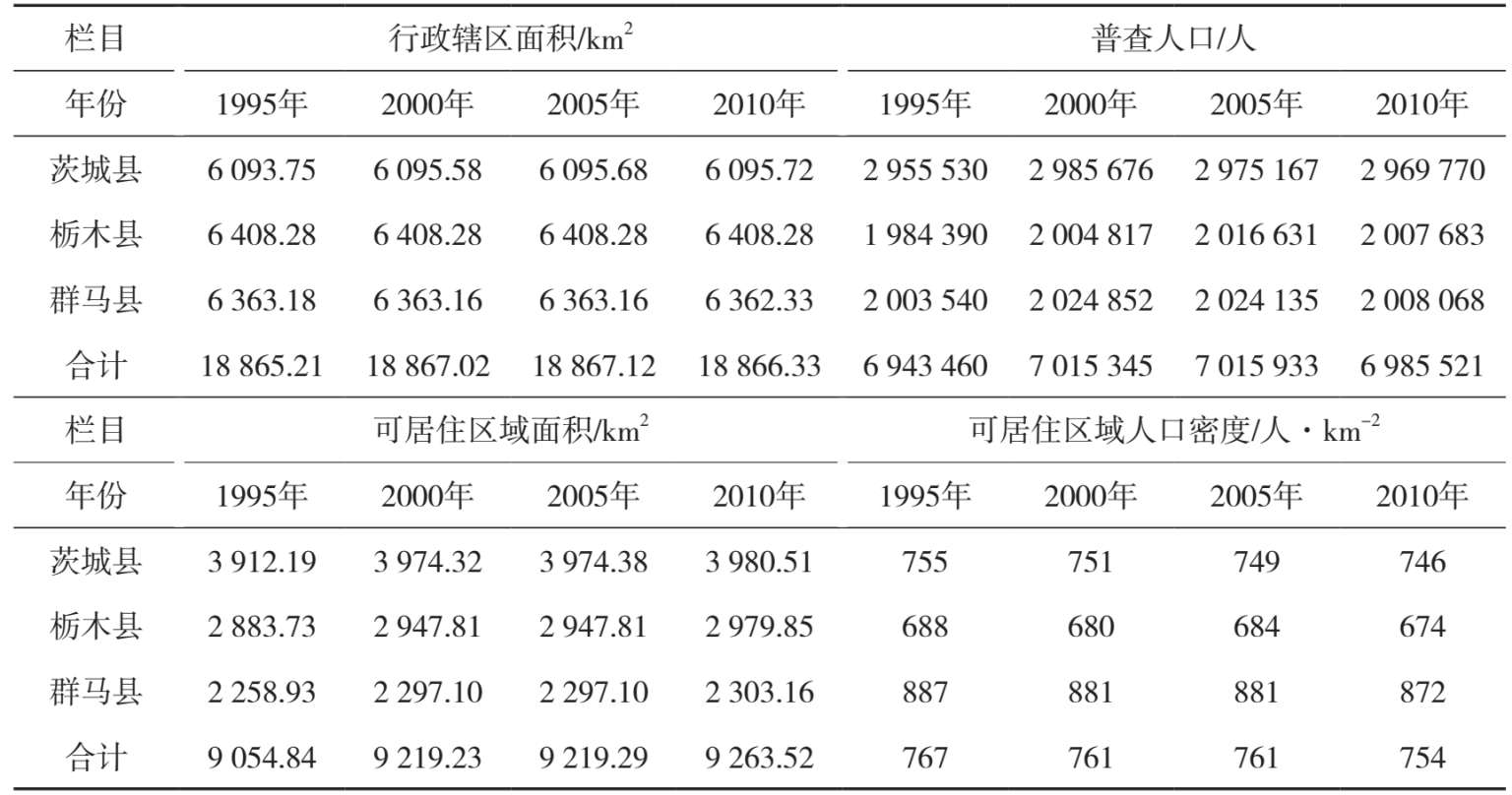 群马县、茨城县和栃木县3个生物生产功能区1995—2010年期间4次人口普查和土地调查获得的人口和可居住区域面积数据如表2-19所示。1995—2010年期间可居住区域人口密度的变化如图2-13所示。可以看出,群马县可居住区域人口密度较高,栃木县可居住区域人口密度较低,而茨城县居中。
