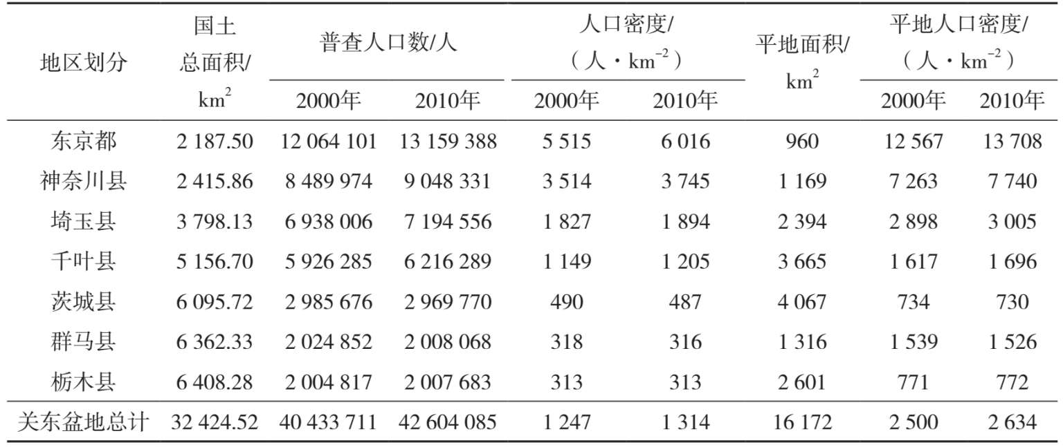 东京位于日本本州关东平原南部,水土光热条件较好,物产丰富。1457年,一位名叫太田道灌的武将在此构筑了江户城,随后迅速发展成为关东地区的商业中心。1603年,日本建立了中央集权的德川幕府,江户城又迅速发展成为日本的政治中心。1868年,日本建立明治新政府,江户改称为东京,设立东京府(明治时代)。1943年,日本政府颁布法令,将东京市改为东京都,并扩大了它的管辖范围。目前东京都总面积2 187.5 km 2 ,除了其西部的山地和流经市区的河川外,1 322 km 2 相对平坦的区域均已完全被各类人文发展设施所占据。2010年东京都的人口密度已经达到6 016人·km -2 。但是东京都并不是一个功能配套完善的独立城区,而是与周边区域具有密切联系的一个大都会区的一个功能单元。这个大都会区是依托一个具有重要生态功能和人文发展潜力的地域单元而发展起来的,这个地域单元就是关东盆地。