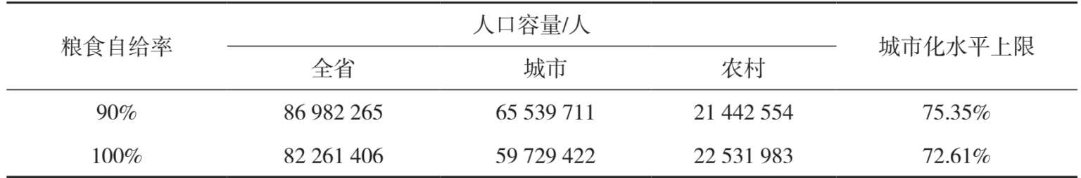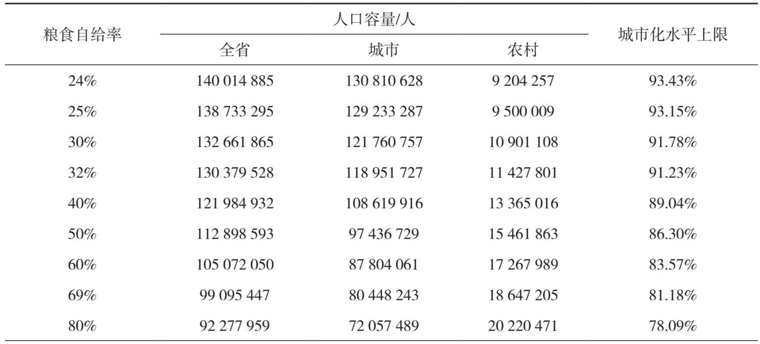 同时,粮食自给率还决定了城市化水平的上限。在粮食自给率为24%的情况下,城市化水平的上限可以达到93.43%。而在100%粮食自给的情况下,城市化水平的上限只有72.61%。国家主体功能区规划给广东省划定了56 939.5 km 2 的农产品主产区,在国家主体功能区规划框架约束下,广东省的最大人口容量为1.3亿人,粮食自给率最多可达31.44%。