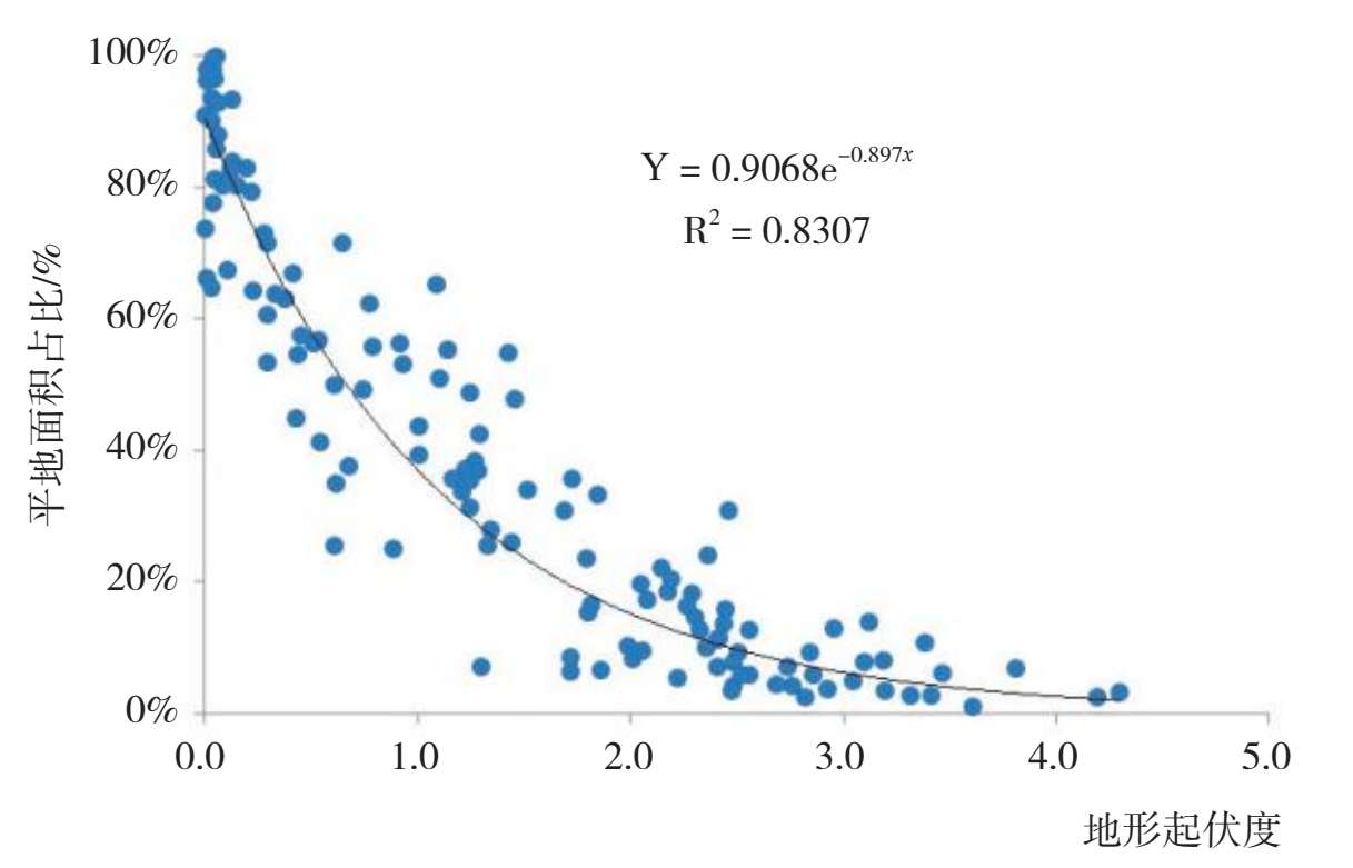 图2-3 地形起伏度指数与平地面积占比关系散点