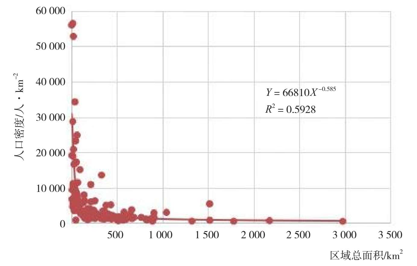 随着时间的推移,拟合函数的幂指数数值有减小的趋势,根据2000年和2010年散点图显示,当适宜人居面积为1 500km 2 的时候,有一点不在拟合曲线上,该点的适宜人居区域人口密度较高,经查证,该点数据对应东莞市,适宜人居面积1 517.28km 2 ,适宜人居区域人口密度为5 418人·km -2 。依据此数据可得到幂指数函数的指数极端值为-0.4。