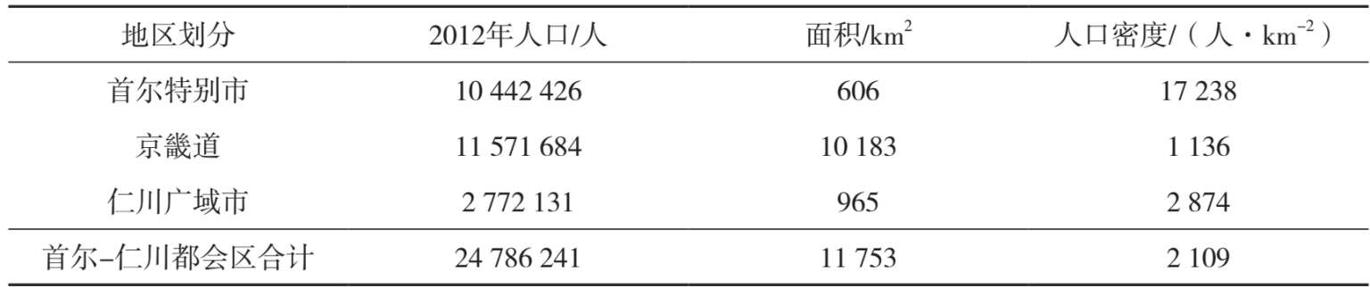 再看看韩国的大首尔都会区。首尔位于朝鲜半岛中段的西部,汉江汇入黄海处的三角洲平原上。汉江是由起源于韩国大德山(又名太白山)的南汉江和起源于朝鲜金刚山的北汉江(金刚江)所组成的水系。南汉江和北汉江这两条主要河流在京畿道汇合成为汉江,然后流经首尔,于河口处与临津江(长54km)、礼成江(长174km)相汇,最后注入黄海(韩国称其为西海)江华湾。汉江全长514km,流域面积3.4万km 2 ,多年平均流量 670 m³·s -1 。汉江三角洲区域的平地是韩国最大的一片适宜人居的区域,韩国人口不断往这里汇聚,2012年人口总量达到2 472万,接近韩国人口总量的一半。这片区域在行政区划上分属首尔特别市、京畿道和仁川广域市三个一级行政单元(图2-6)。首尔特别市是韩国的首都,2012年末,全市人口总量(登记居民+登记外国人)为10 442 426人,人口密度达17 238人·km -2 。与东京一样,如此高密度的城市区域也离不开周边低密度区域配套的的资源支撑和生态屏障功能。环绕首尔的京畿道人口密度只有1 136人·km -2 。相邻的仁川市人口密度也只有2 874人·km -2 。由这三者组合而成的首尔-仁川都会区2012年人口密度为2 109人·km -2 (表2-16)。