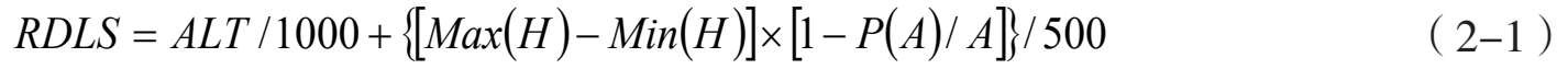 地形起伏度(RDLS)反映区域地形地貌特征,用海拔高度和地表切割程度综合表征。《国家人口发展功能区工作技术导则》提出了一个地形起伏度计算模型,计算公式为: