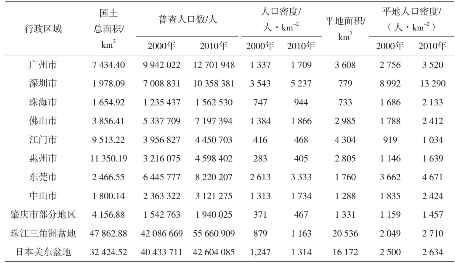 但是,按适宜人居区域(平地)面积来衡量,珠江三角洲盆地内平地人口密度为2 710人·km -2 ,大于日本关东盆地的2 634人·km -2 。 就适宜人居区域总体人口密度而言,珠江三角洲盆地已经超过日本关东盆地。但是,珠江三角洲各区域的功能分异没有关东盆地那么明显。珠江三角洲盆地内各行政区域2010年平地人口密度变化为1 601 ~13 290人·km -2 ,而关东盆地各行政区域平地人口密度变化为772 ~13 708人·km -2 ,关东盆地各行政区域平地人口密度变化幅度明显大于珠江三角洲盆地,说明日本关东盆地各行政区域的人口发展功能分异更明显一些,而珠江三角洲盆地各行政区域的人口发展功能更趋雷同。