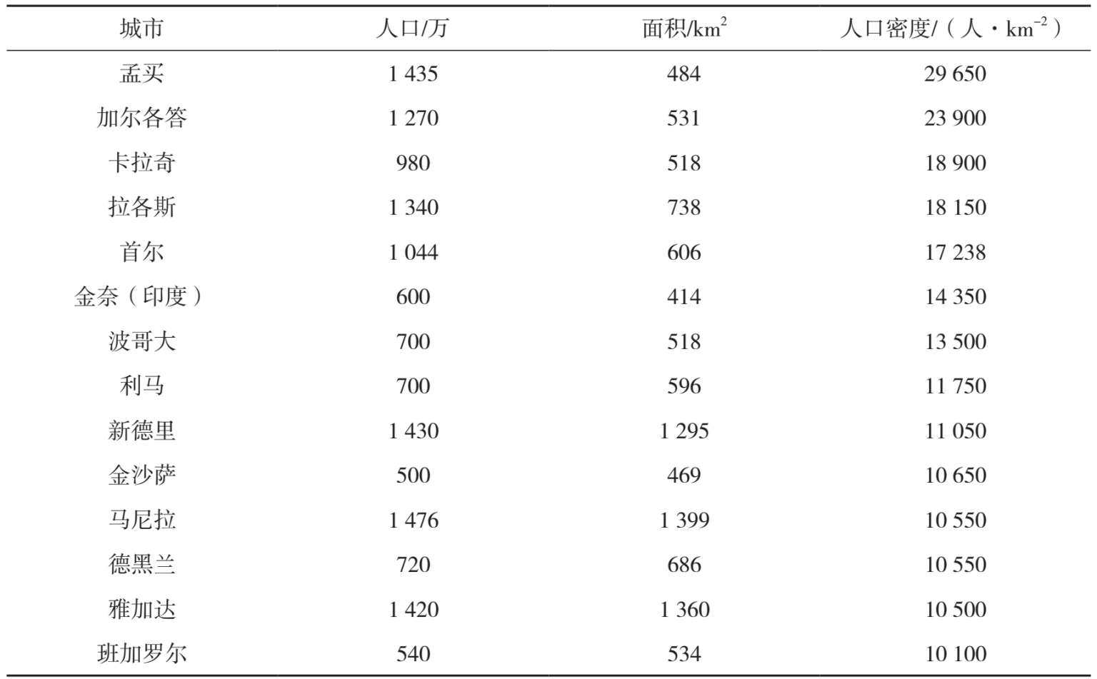 表2-18 世界人口最密集的超大城市