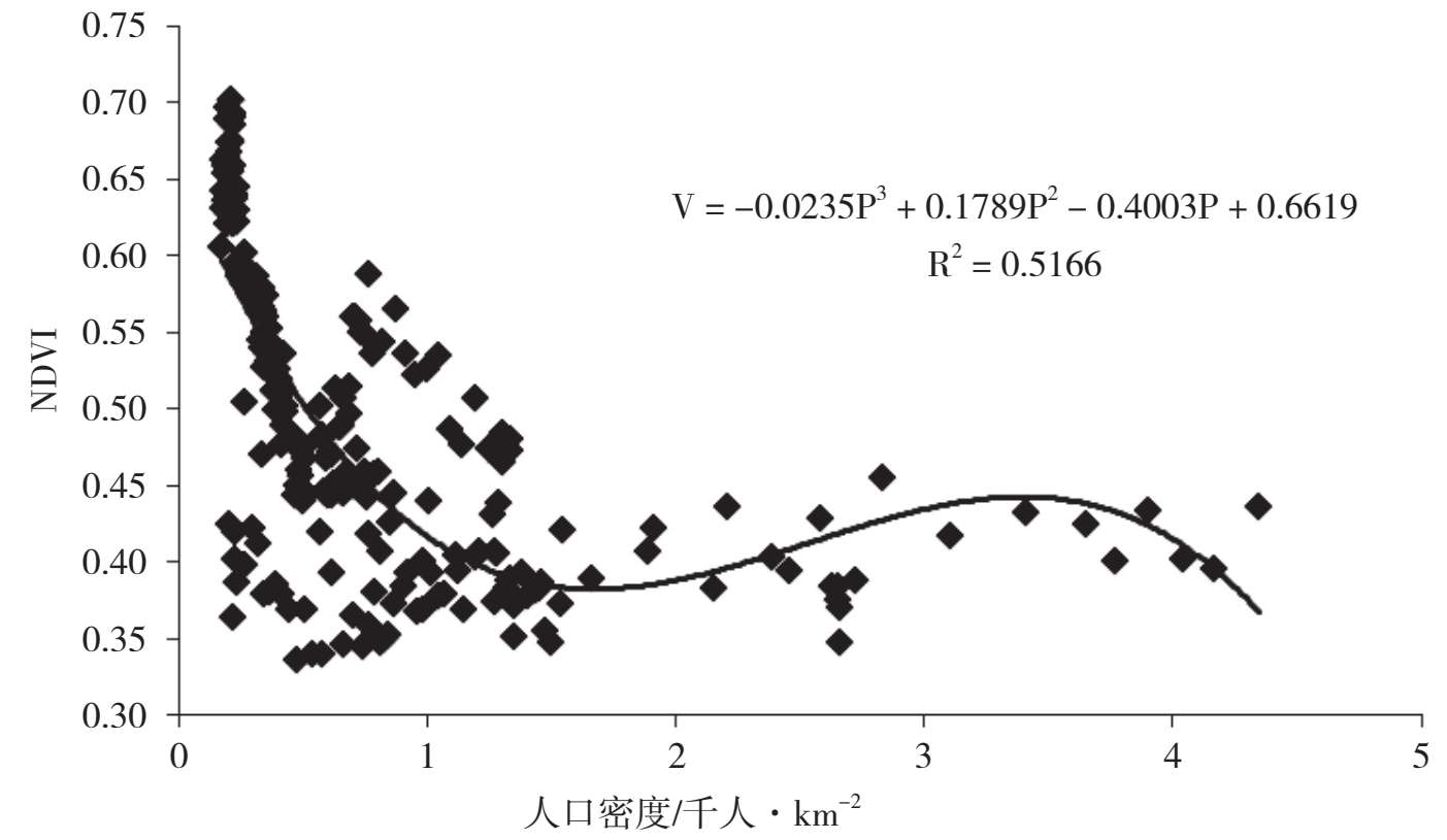 此外,一个地区的人口密度还涉及人与自然关系的和谐问题。我们研究了广东省高度城市化区域人口密度与植被指数变化的关系:当人口密度<2 200人·km -2 或>3 820人·km -2 时,植被指数会随着人口增长而明显下降(图2-12)。也就是说,当人口密度>3 820人·km -2 时,人与自然关系就难以协调了。