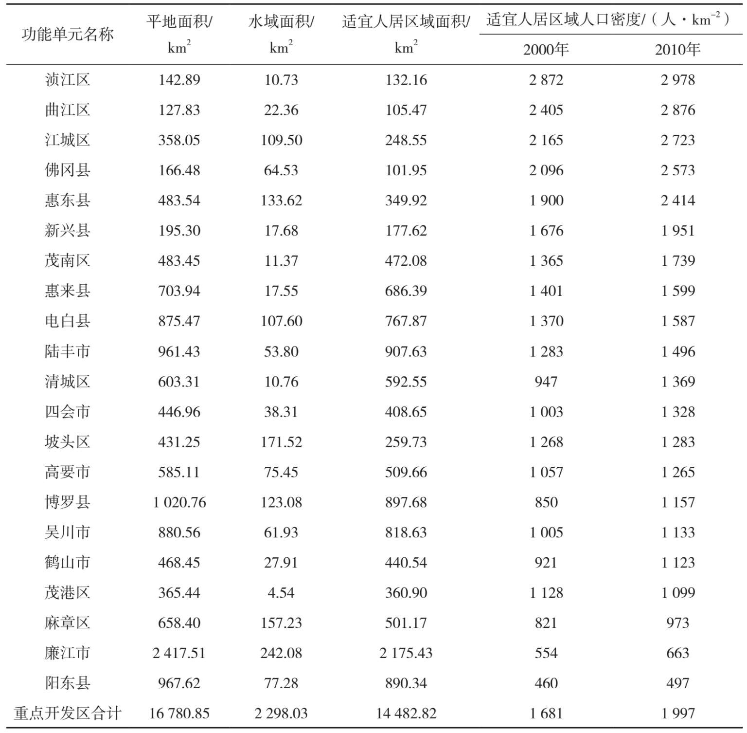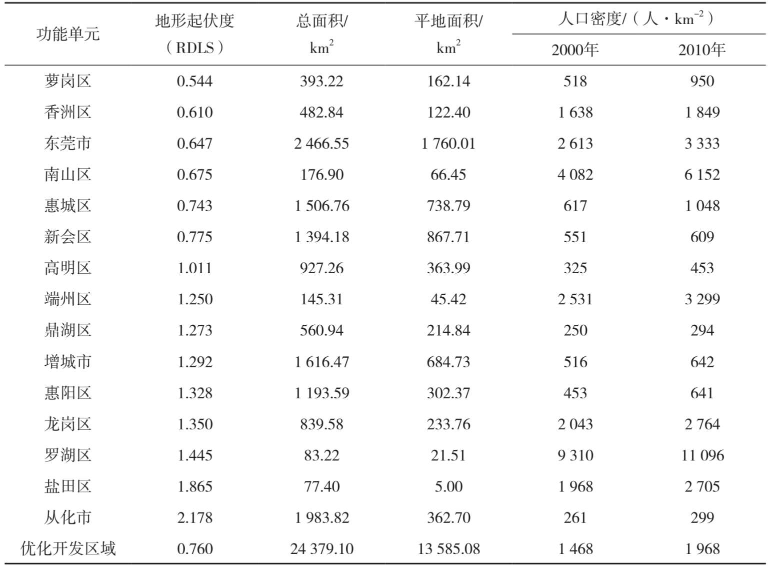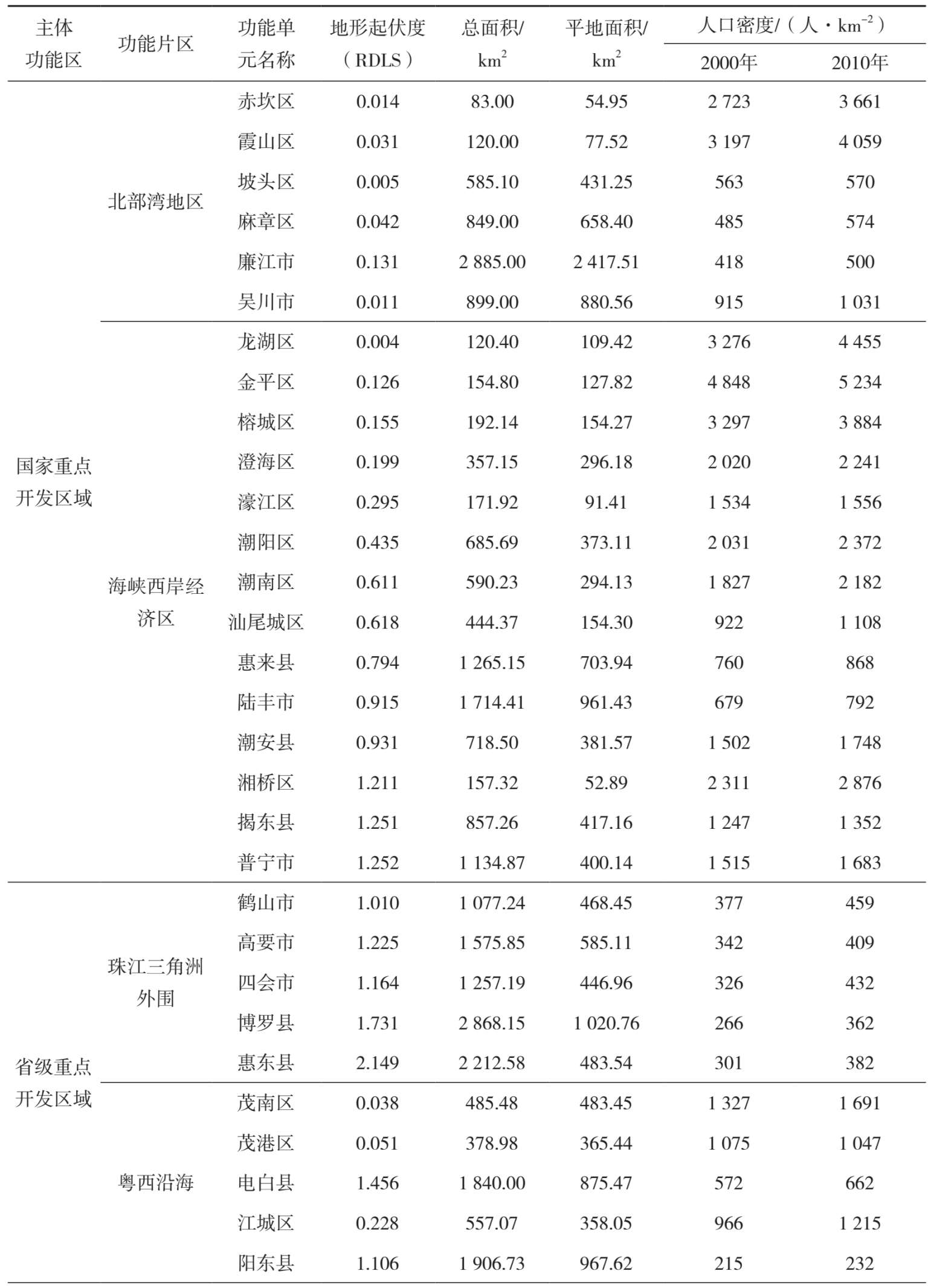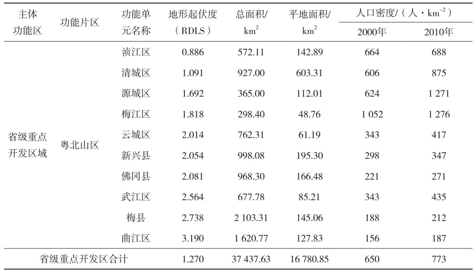 广东省主体功能区规划确定的重点开发区域包括40个功能单元,总面积37 437.63 km 2 ,平均地形起伏度1.27,其中有平地面积16 780.85 km 2 ,平地面积占总面积的44.82%。显然,上述区域并不是最适宜人居生活的区域,这也是这些区域至今尚没有得到高强度开发的根本原因。