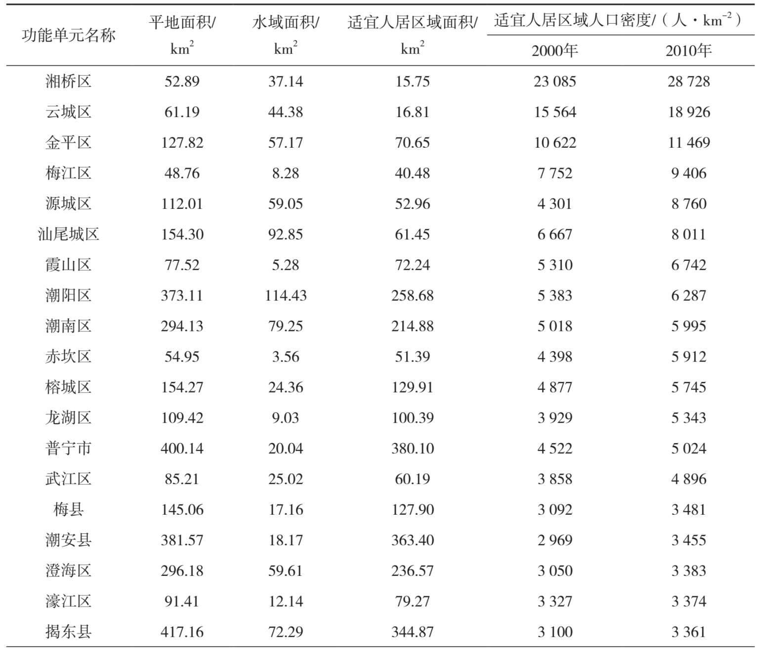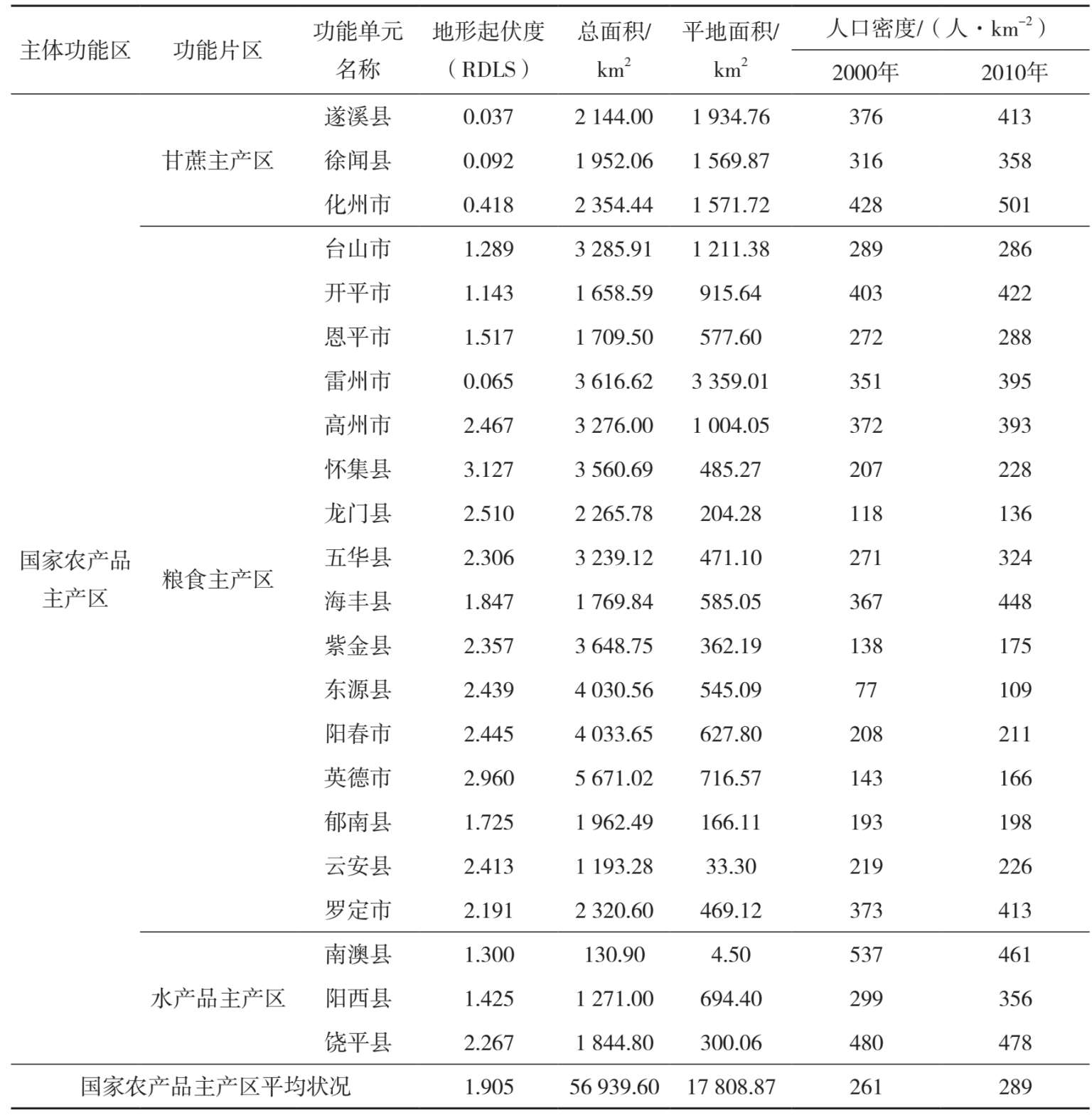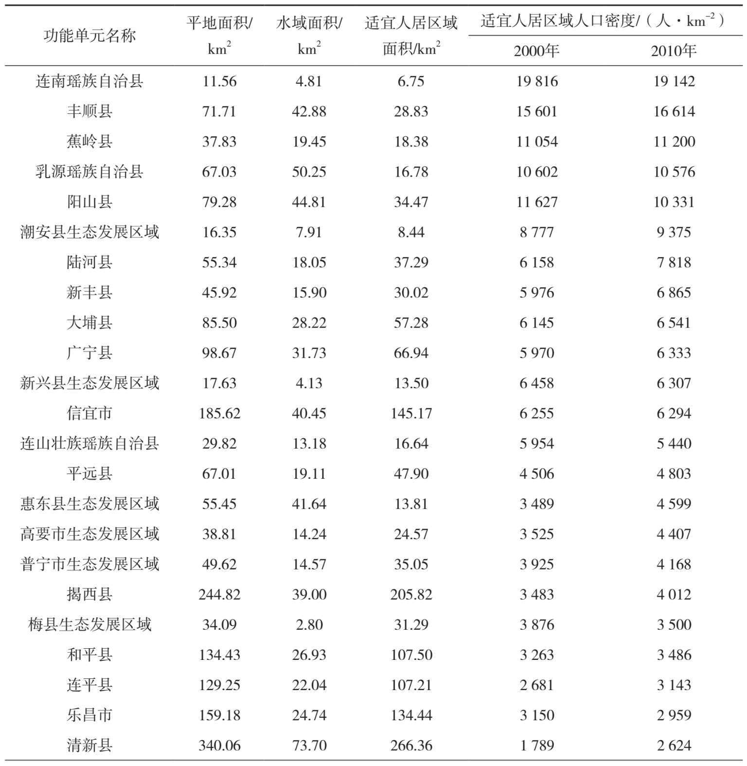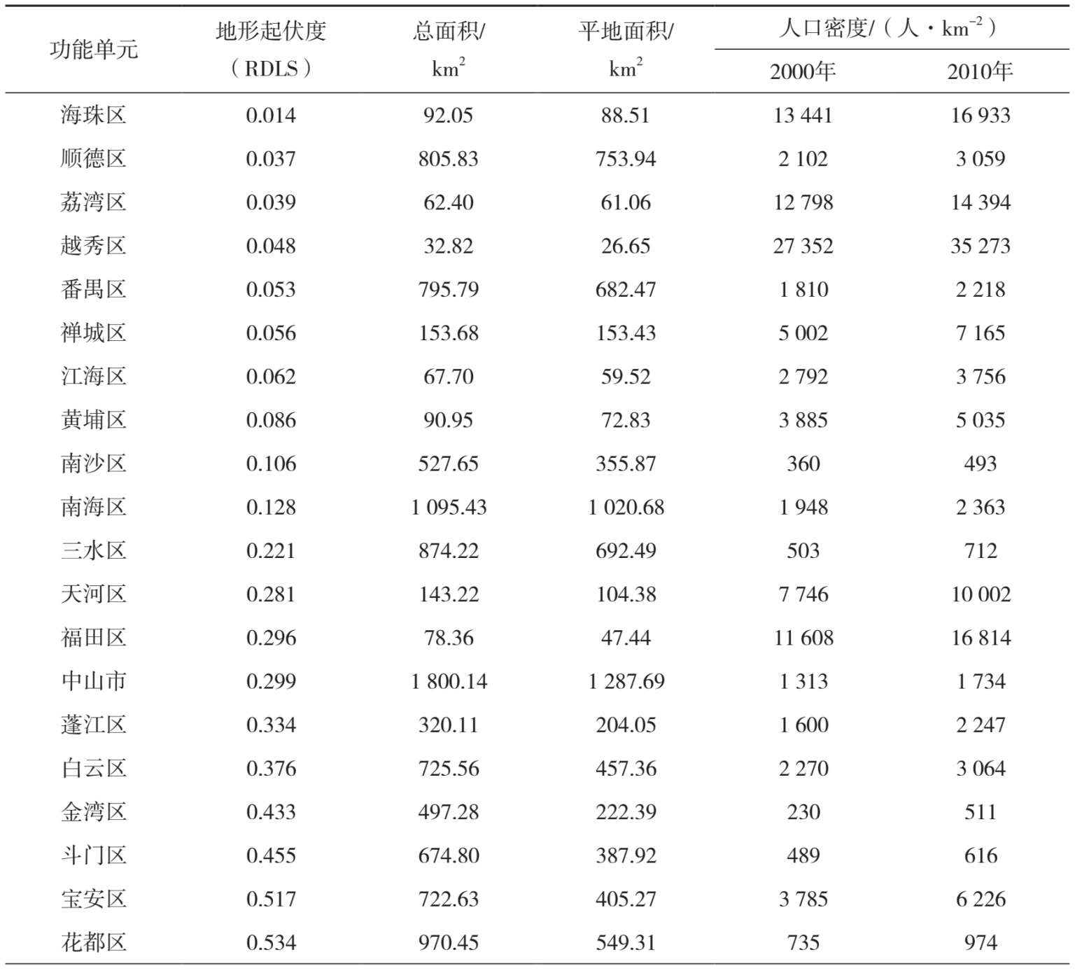 广东省主体功能区规划确定的重点开发区域包括40个功能单元,总面积37 437.63 km 2 ,平均地形起伏度1.27,其中有平地面积16 780.85 km 2 ,平地面积占总面积的44.82%。显然,上述区域并不是最适宜人居生活的区域,这也是这些区域至今尚没有得到高强度开发的根本原因。