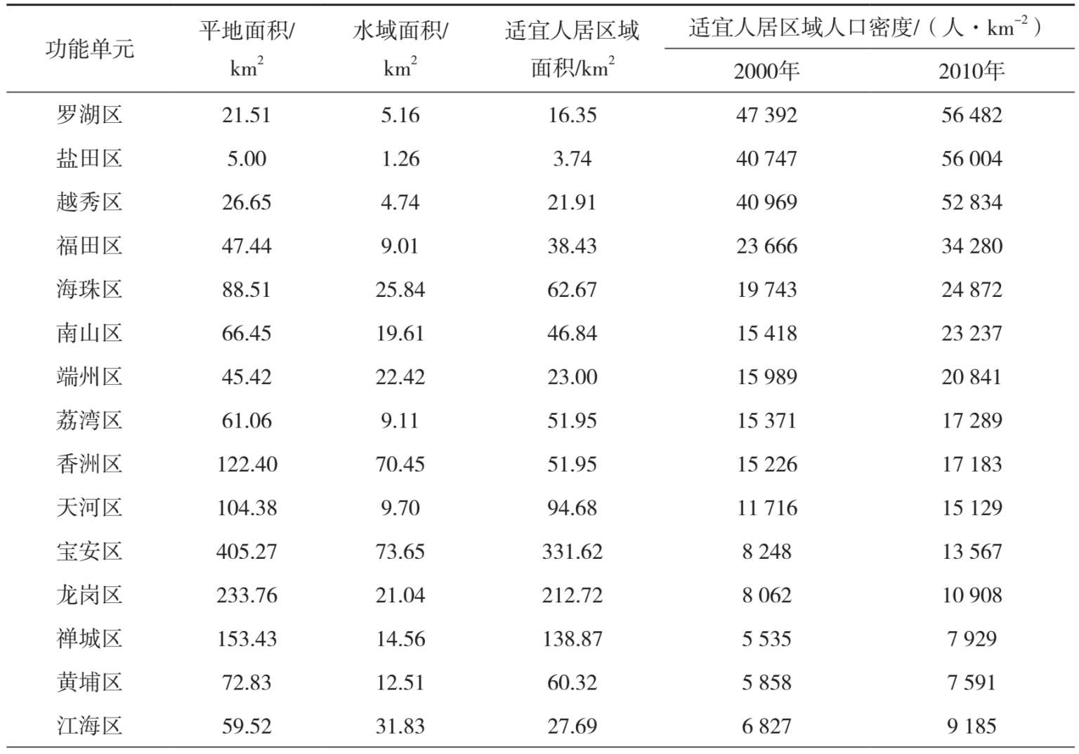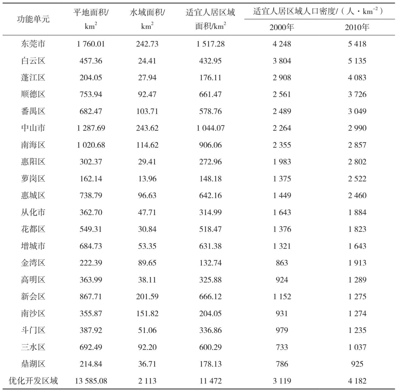 优化开发区域包括35个功能单元,地处珠江三角洲平原,大多数单元地形比较平坦,平均地形起伏度0.76,平地面积13 585 km 2 ,占优化发展区总面积的55.72%。广州市的海珠区、荔湾区、越秀区、黄埔区、番禺区,佛山市的顺德区、禅城区和江门市的江海区等8个功能单元区域地形起伏度小于0.1,平地面积占总面积的80%以上;广州市的南沙区、天河区、白云区、花都区、萝岗区,佛山市的南海区、三水区,深圳市的福田区、宝安区、南山区,珠海市金湾区、斗门区、香洲区,江门市的蓬江区、新会区,惠州市惠城区和中山市、东莞市等18个功能单元地形起伏度小于1,平地面积占总面积的比例大多超过50%;而佛山市高明区,肇庆市的端州区、鼎湖区,广州市的增城市、从化市,惠州市惠阳区,深圳市的龙岗区、罗湖区、盐田区等8个功能单元地形起伏度大于1,平地面积占比少于40%,其中从化市地形起伏度达2.178,属于典型的山区,平地不足总面积的20%(表2-22)。优化开发区域作为一个整体,2010年人口密度为1 968人·km -2 ,如果只考虑平地,则平地人口密度达3 531人·km -2 。如果要把珠江三角洲建设成为适宜人居的现代化大都市区,人口密度已经没有多大潜力空间了。考虑到珠江三角洲地区位于珠江的下游,水网密布,相当一部分低洼的平地为河道和湖泊等水体占据,计算适宜人居住生活的区域还要扣除这些水域。经计算,优化开发区域扣除水域后的平地(可居住区域)平均人口密度为4 182人·km -2 (表2-23),已超过美国首都华盛顿特区可居住区域2010年的人口密度(3 941人·km -2 )。其中,深圳罗湖区、盐田区和广州市越秀区的适宜人居区域人口密度已经超过50 000人·km -2 ,其人口密度肯定不能再增加了,居住在这些区域的相当一部分人实际上是依靠周边区域的资源在维持其生活品质,比如广州市越秀区的不少居民就在增城和从化拥有别墅。深圳市的福田区、南山区、宝安区、龙岗区,广州市的海珠区、荔湾区、天河区,珠海市香洲区和肇庆市端州区、适宜人居区域人口密度也已经超过10 000人·km -2 ,进一步提高人口密度的潜力非常有限。此外,各市中的禅城区、黄埔区、江海区、白云区和蓬江区以及东莞市的适宜人居区域人口密度在4 000~10 000人·km -2 之间,按优质生活区域的人口密度标准,也没有人口承载潜力可挖了。其他16个功能单元的适宜人居区域人口密度小于4 000人·km -2 ,其人口承载还有一定的潜力可挖。这些功能单元区域适宜人居区域总面积7 501km 2 ,目前适宜人居区域平均人口密度2 100人·km 2 ,按人口密度不超过4 000人·km -2 的控制标准,还可以增加1 425万人。