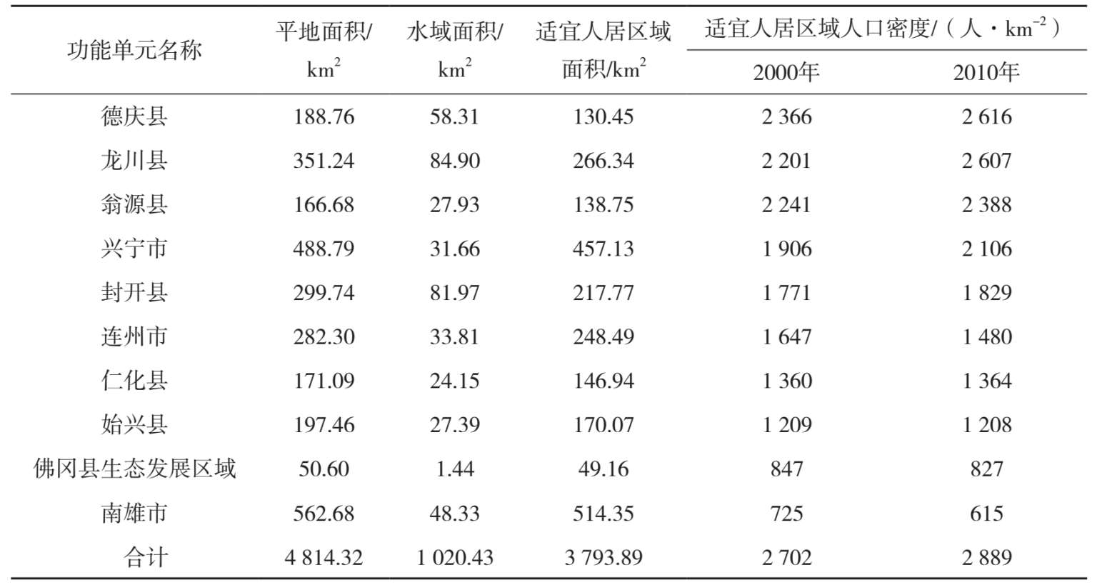 广东省重点生态功能区2010年人口密度为49~611人·km -2 ,平均为179人·km -2 ,似乎人口非常稀少。但是适宜人居的平地面积非常有限,一共只有4 814.32km 2 ,而且山区的平地一般分布在低洼的河谷地带,山区的地势又使雨洪往低洼地带汇集,这些低洼地带的平地又有相当一部分被河流、水库等水域占据,真正适宜人居生活的区域非常小,扣除水域后的平地面积只有3 794km 2 ,2010年适宜人居区域人口密度2 889人·km -2 (表2-31)。其中,连南瑶族自治县、丰顺县、蕉岭县、乳源瑶族自治县和阳山县5个功能单元的适宜人居区域人口密度已超过1万人·km -2 ,处于严重超载状态;潮安县生态发展区域、陆河县、新丰县、大埔县、广宁县、新兴县生态发展区域、信宜市、连山壮族瑶族自治县、平远县、惠东县生态发展区域、高要市生态发展区域、普宁市生态发展区域和揭西县13个功能单元的适宜人居区域人口密度均超过了4 000人·km -2 ,人口已经饱和。梅县生态发展区域、和平县、连平县、乐昌市、清新县、德庆县、龙川县、翁源县、兴宁市、封开县、连州市、仁化县、始兴县、佛冈县生态发展区域和南雄市等15个功能单元的适宜人居区域2010年人口密度少于4 000人·km -2 ,人口承载力还有一定程度的富余。这15个功能单元适宜人居区域面积合计2 986km 2 。2010年人口密度平均1 934人·km -2 ,按4 000人·km -2 的标准,还有约617万人口的富余承载力。