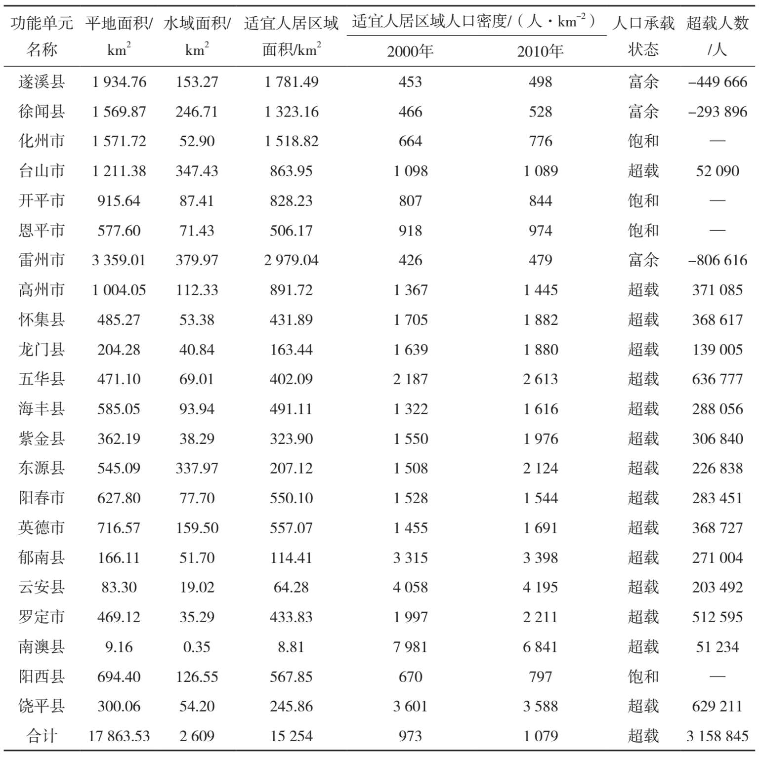 主体功能区规划划定的农产品主产区总面积56 939.60 km 2 ,其中有平地面积17 863 km 2 ,平地面积占31.37%,平均地形起伏度为1.905,大多属于丘陵台地区域。农产品主产区域的农业生产要需要占用大量的平地,这些平地的人口承载力大大低于人文发展区域。2010年人口密度在109~501人·km -2 ,平均为289人·km -2 (表2-28)。适宜人居区域(扣除水域后的平地)人口密度为1 079人·km -2 。即使在这样的人口密度下,人口也是超载的,每年还要从农产品主产区转移人口约25万人。按农产品主产区目前总承载力1 569.31万人计算,扣除水域后的平地区域(15 254 km 2 )人口密度为1 029人·km -2 。也就是说,在2020年前的生产力水平下,广东省农产品主产区人口承载力的弹性极限是1029人·km -2 ,比该类区域适宜人口密度750人·km -2 高出37%。我们以人口密度1 029人·km -2 作为农产品主产区人口承载力状态判断的临界值,扣除水域后的平地区域人口密度大于1 029人·km -2 ,人口承载力处于超载状态;人口密度介于750 ~1 029人·km -2 ,人口承载力处于饱和状态;人口密度小于750人·km -2 ,人口承载力处于富余状态。表2-29计算结果表明,只有3个功能单元区的人口承载力处于富余状态(全部在雷州半岛),4个单元区人口承载力处于饱和状态(分别是阳西县、恩平市、开平市和化州市),其他区域均处于超载状态,该类功能区总体超载315万人口。