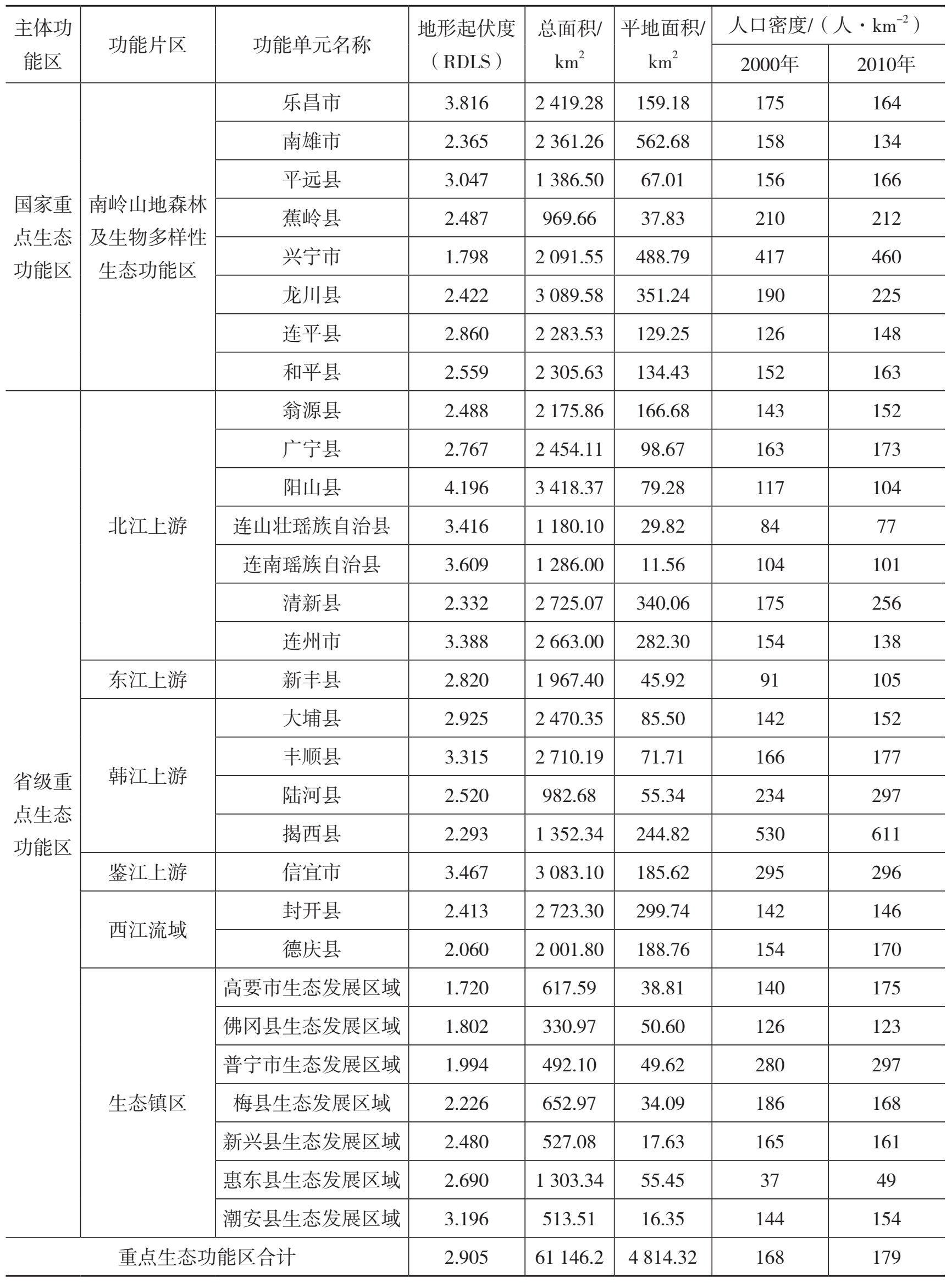 广东省主体功能区规划确定的重点生态功能区域包括国家重点生态功能区和省级重点生态功能区2大类33个功能单元,总面积61 146.22km 2 ,平均地形起伏度2.905,其中平地面积4 814.32km 2 ,平地面积占总面积的7.87%(表2-30)。