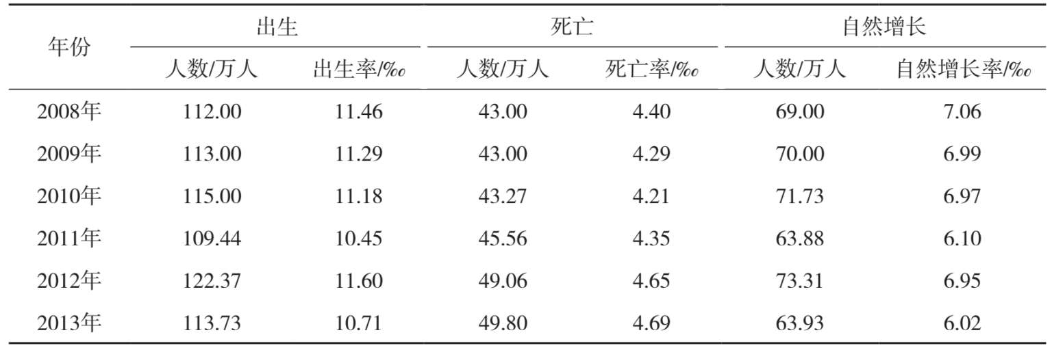 ,自然增加的人数只有689万人(表2-36),而省外迁移流入的移民达1 235万人,平均每年净迁移流人口123.5万人(户籍口径统计这10年累计净迁入人口为333.91万人,平均每年净迁入人口只有33.39万人,而未迁户口流入的人口达90万人/年)。高速的人口增长是改革开放在广东先行先试引来“孔雀东南飞”的结果。随着改革开放的春风吹遍全国,如此之高的年均人口增长速度今后很难在广东再现了。最近3年广东的人口增长态势出现了明显的变化,根据广东省统计局按抽样调查数据统计的结果(见《广东统计年鉴2013》)推算,2011年净移入的省外人口只有1 800人,2012年净移入的省外人口为15.69万人,2013年净移入的省外人口为 -13.93万人,省际迁移人口变成了净流出,过去的人口流入洼地现今变成了人口流出的高地。从2009年开始,连续5年广东全省人口自然增长率保持在7‰以下(表2-37),如果在计划生育政策不做大的调整的前提条件下,估计今后的自然增长率很难再超过7‰。从2014年开始,全国各地逐步放开了单独二孩生育政策,预计未来一段时期,人口自然增长率会略有回升,但应该不会超过9‰。《国家新型城镇化规划(2014—2020年)》提出了到2020年让1亿左右农业转移人口在城镇落户和城市化水平从目前的2012年的52.6%提高到2020年的60%左右的新型城市化目标,而广东的城市基础设施条件和产业集聚优势应该对农业转移人口有比较大的吸引力,如果广东的重点开发区域再推出一些有力的政策来推动农业转移人口的落户和省外人口的流入,在2020年前有可能再次出现一波类似2000—2010年期间那样的外来人口流入高潮(即平均每年净迁移流入人口123.5万人),但是涌入的人口数量应该会有所减少。从2014年开始,按每年从省外迁移流入100万人口,而且人口自然增长率为8.4‰推算,到2020年全省常住人口总量可望突破1.2亿人。