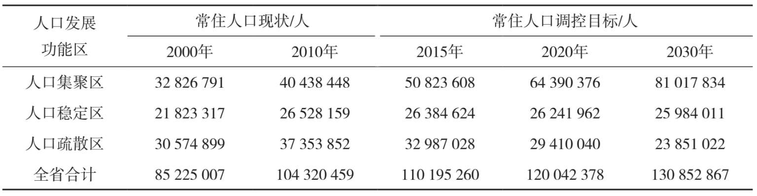 三类人口发展功能区的常住人口数量及未来调控目标见表2-41。到2030年,全省常住人口总量控制在1.3亿左右,其中人口集聚区8 102万人,人口稳定区2 598万人,人口疏散区2 385万人。人口的较快增长应该会出现在2020年之前,2020年以后人口的增长会明显减慢,到2030年以后人口规模将基本稳定下来,人口发展功能区格局也将基本形成。